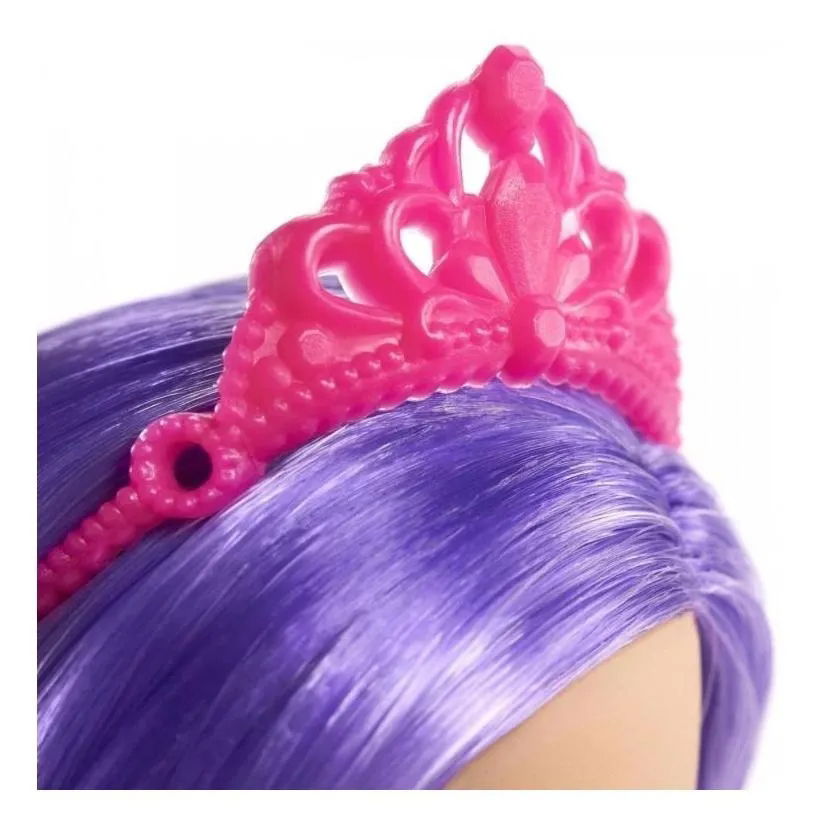 Una tiara rosa con el pelo violeta vibrante de la muñeca Barbie® le da el toque final a su look de hada.