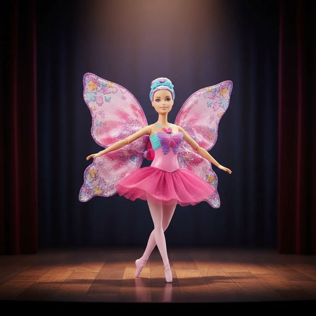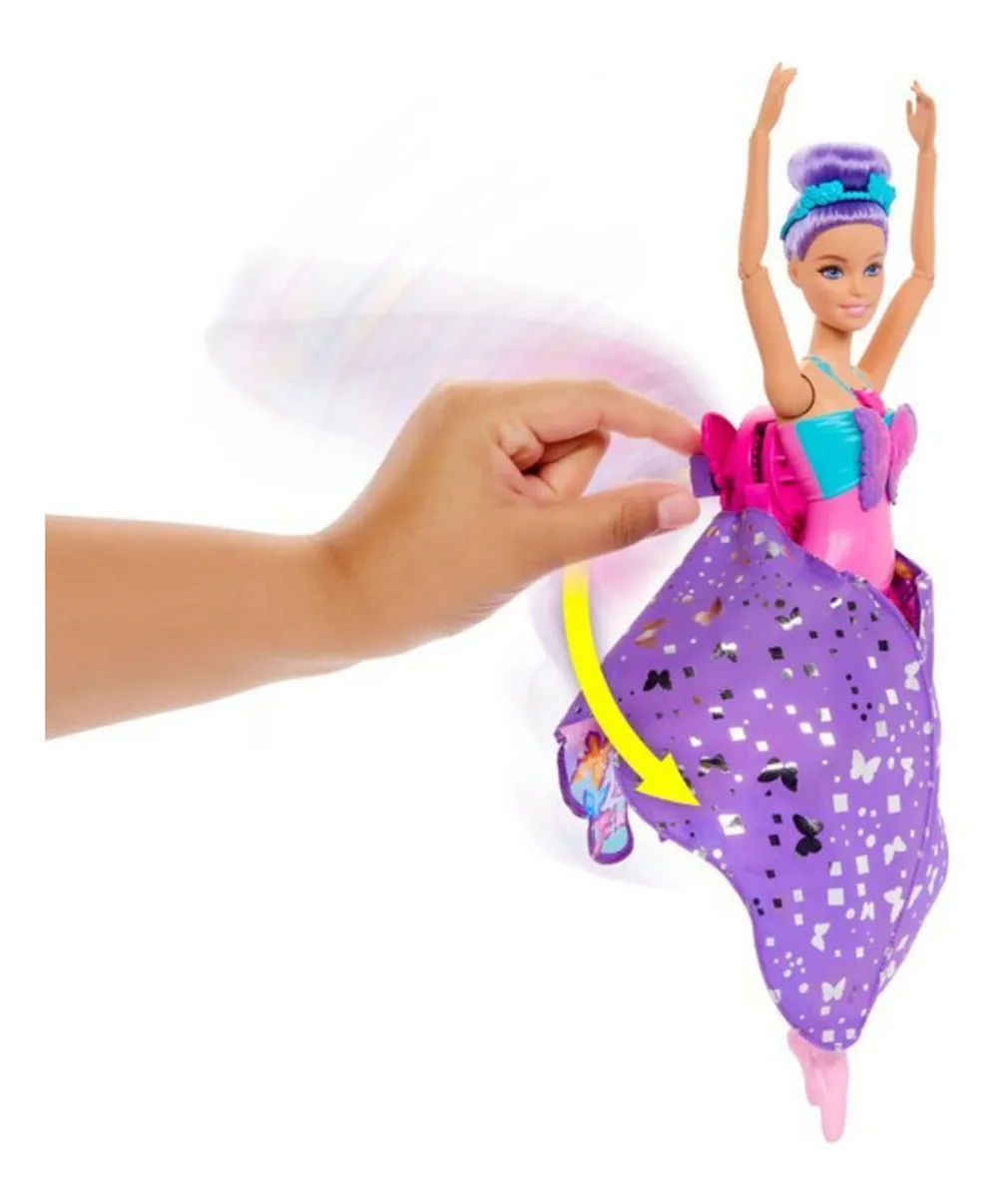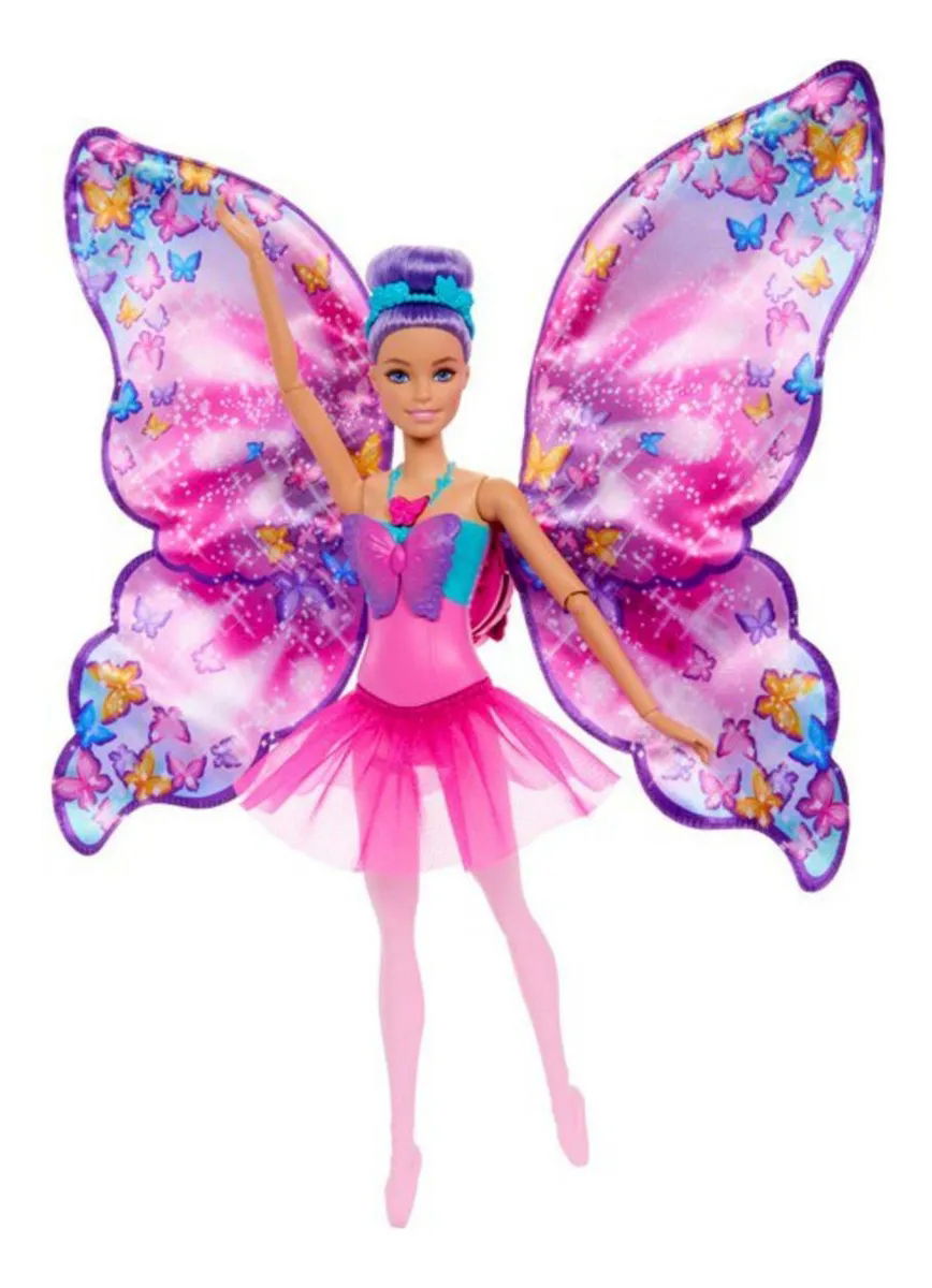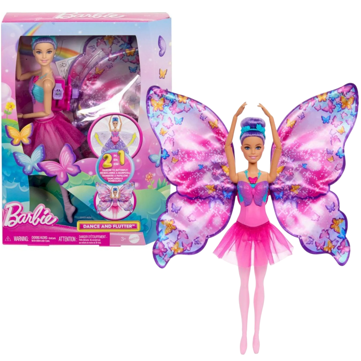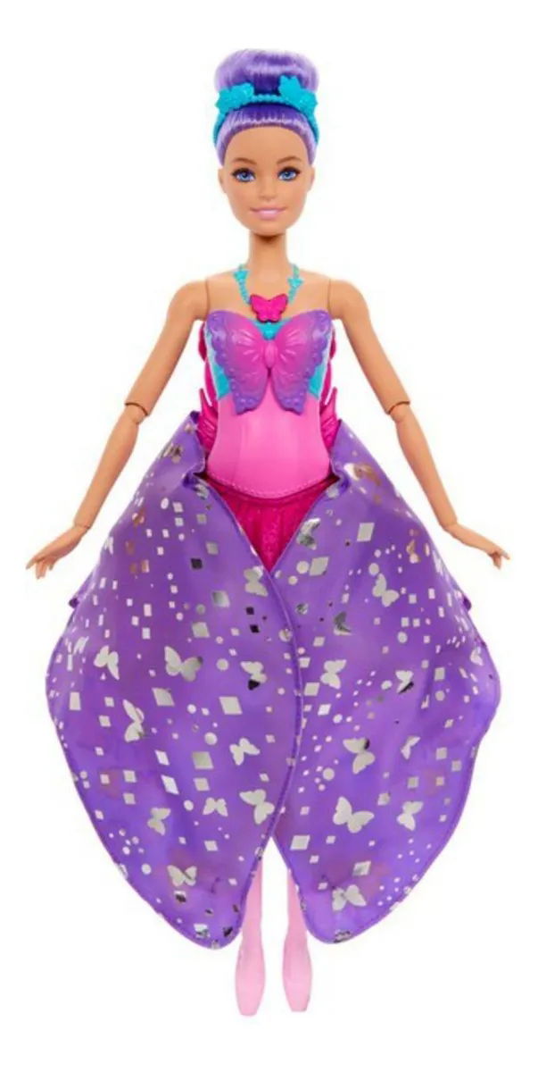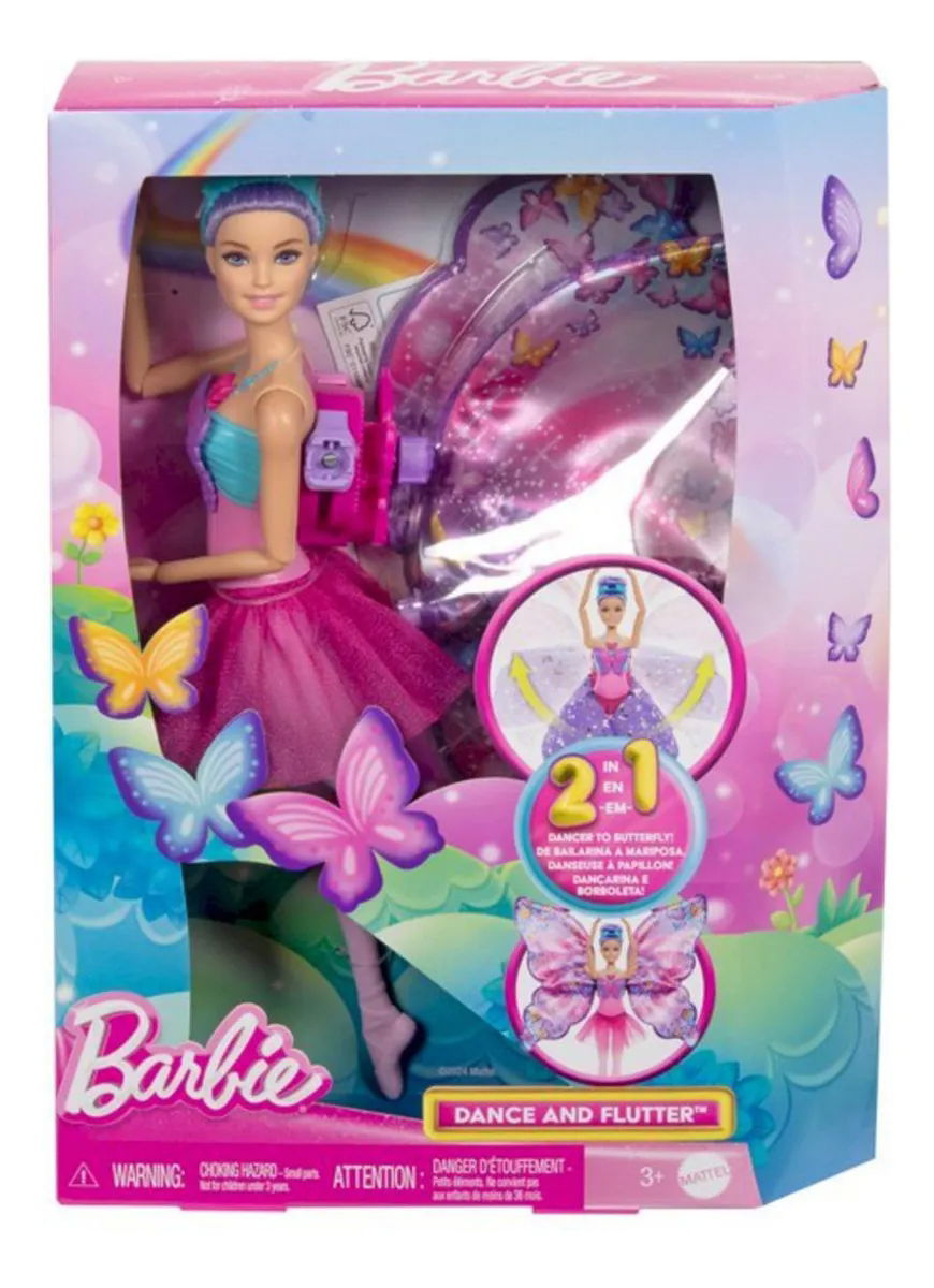 - Descripción: ¡Inspira la imaginación para volar con la muñeca Barbie Dance and Flutter y una transformación mágica 2 en 1! Simplemente presiona el collar en el corpiño de la muñeca y observa cómo su sobrefalda morada se despliega como por arte de magia en grandes alas de mariposa brillantes. Es un momento asombroso que a las niñas les encantará activar una y otra vez. Un encantador peinado de moño morado con una diadema floral, un corpiño deslumbrante y zapatillas de ballet completan el hermoso look.