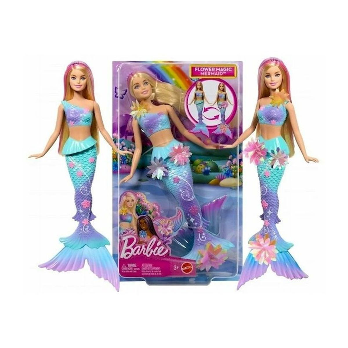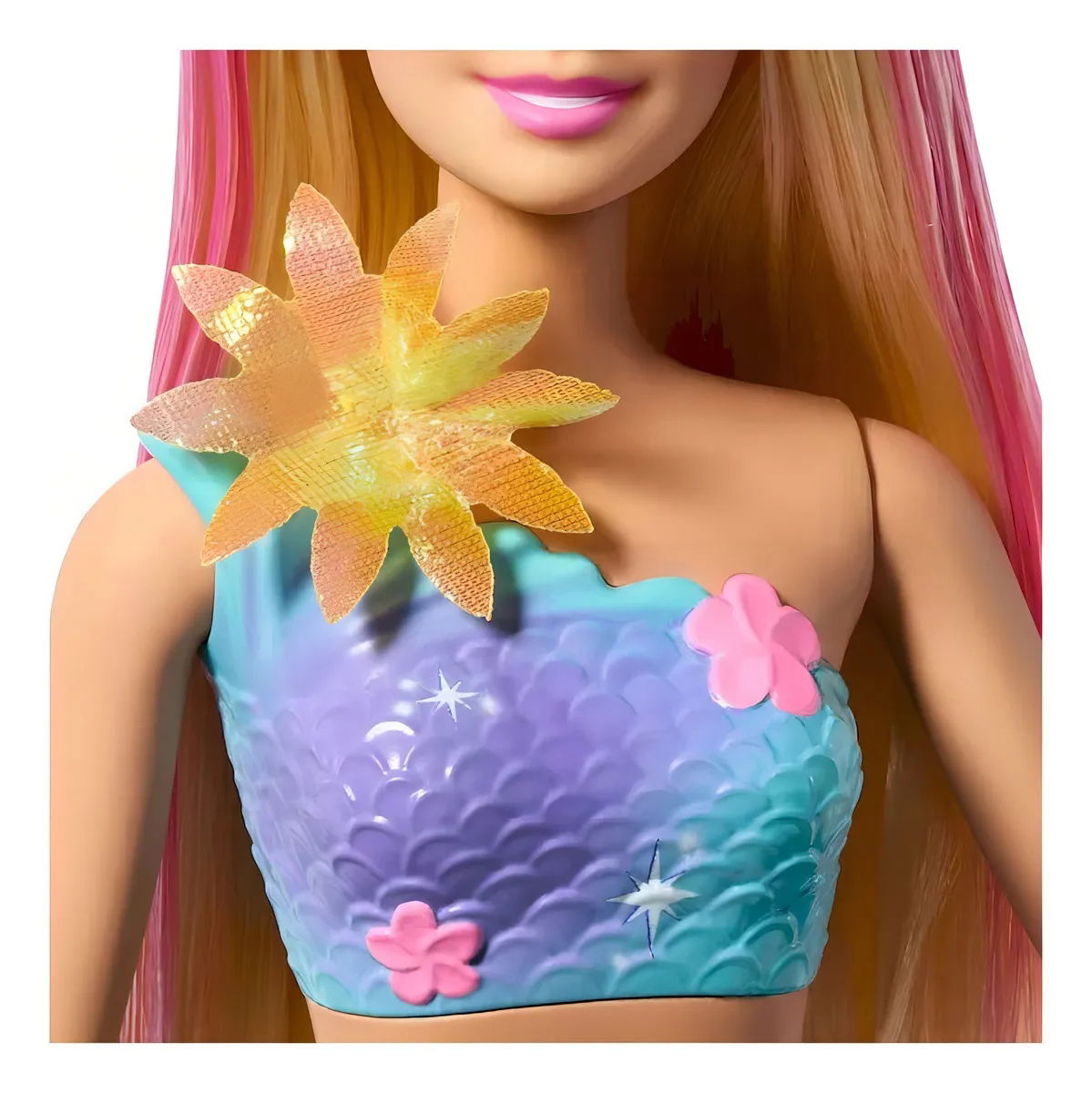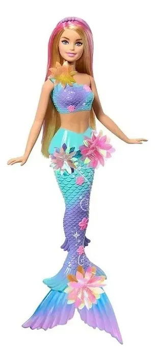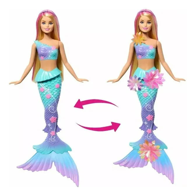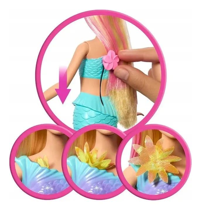 Diseño visual atractivo: Detalles iridiscentes y degradados que evocan un mundo submarino de fantasía. Complementos de fantasía: Diadema de perlas y un cabello estilizado con reflejos rosados para un acabado encantador. Convierte cada momento de juego en una aventura mágica con la muñeca Sirena Barbie Flower.