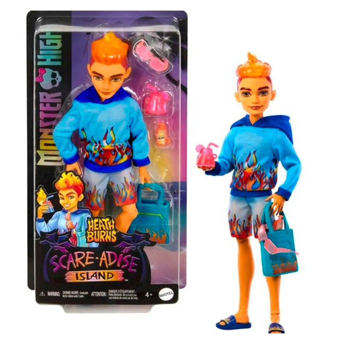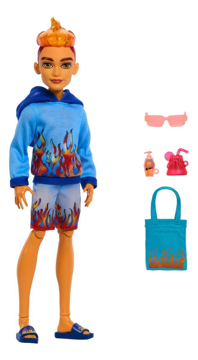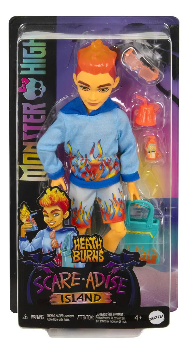 Este muñeco Monster High luce un atuendo de vacaciones listo para la playa. Heath Burns está preparado para pasar un buen rato en su escapada a Scare-adise Island con una sudadera con capucha con estampado de llama, traje de baño y accesorios para crear historias. Apropiado para niños de 4 años en adelante. Para disfrutar de más diversión, revisa toda la línea de muñecas Monster High Scare-adise Island. Se venden por separado y están sujetos a disponibilidad. El muñeco no se puede mantener de pie por sí solo. Los colores y las decoraciones pueden variar.