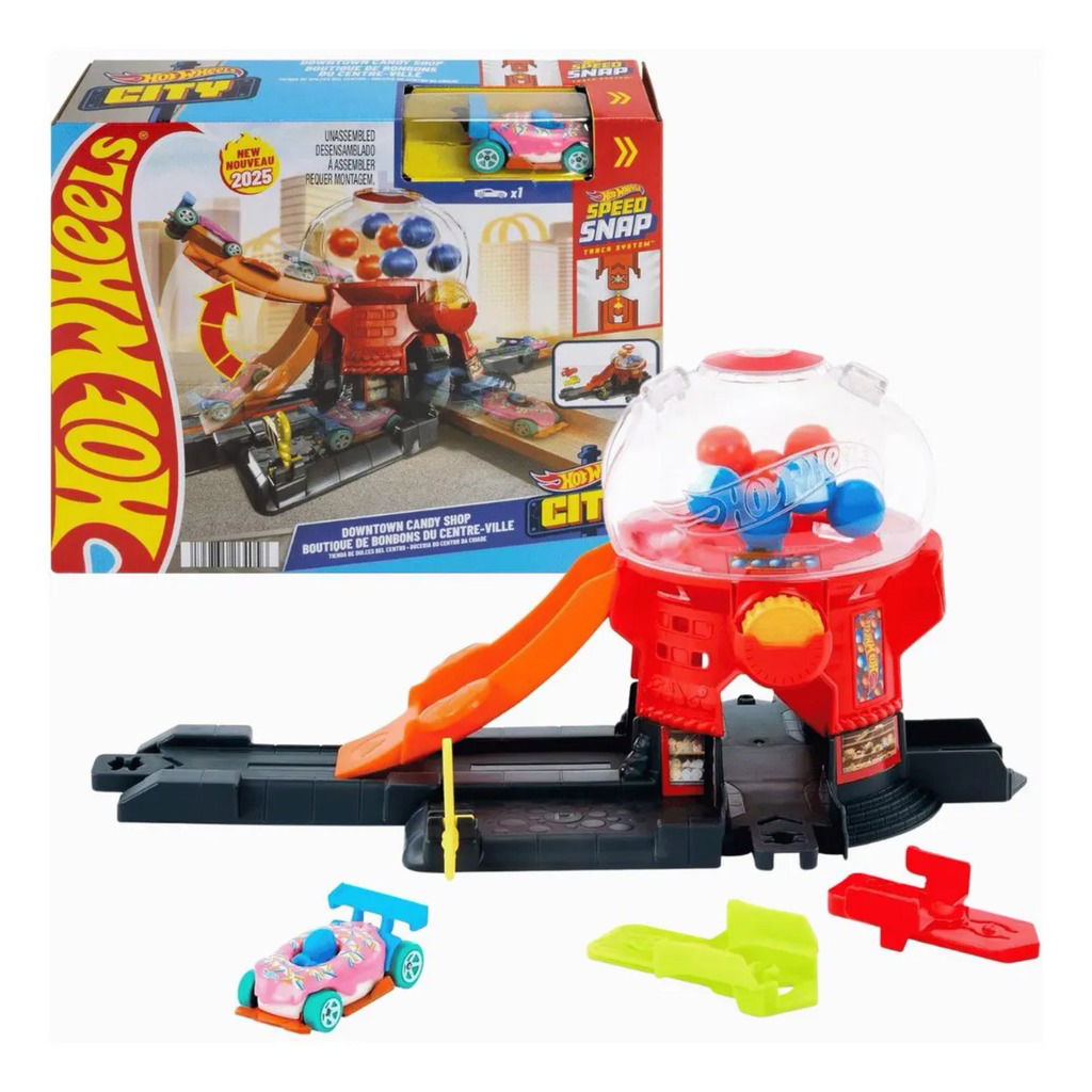 Incluye: Un auto de metal fundido en escala 1:64 con un cuerpo en forma de donut y detalles dulces - Conducen su auto por la rampa levantable que envía su auto a la máquina de gumballs. - Presiona hacia abajo en la moneda en la ranura para hacer que las gumballs se muevan y lanzar el auto por la rampa de salida - La base presenta detalles de juego en pista como una puerta que se mueve para mejorar la narración - Con puntos de conexión de Pista Speed Snap, para conectar fácilmente la Tienda de Dulces del Centro a otros sets y pistas para expandir su Ciudad Hot Wheels.