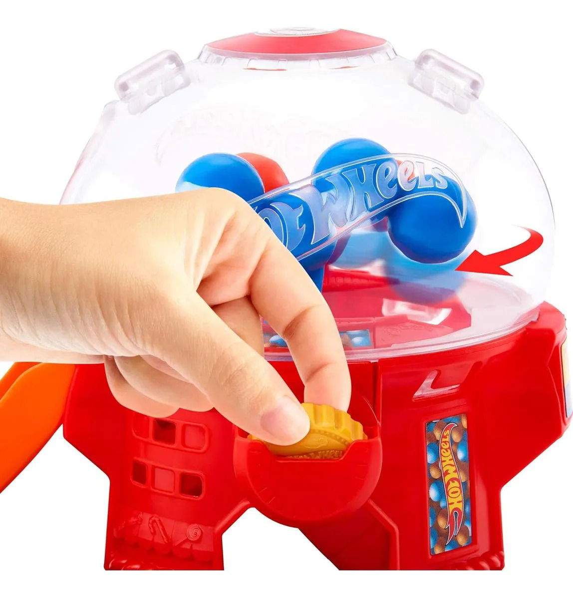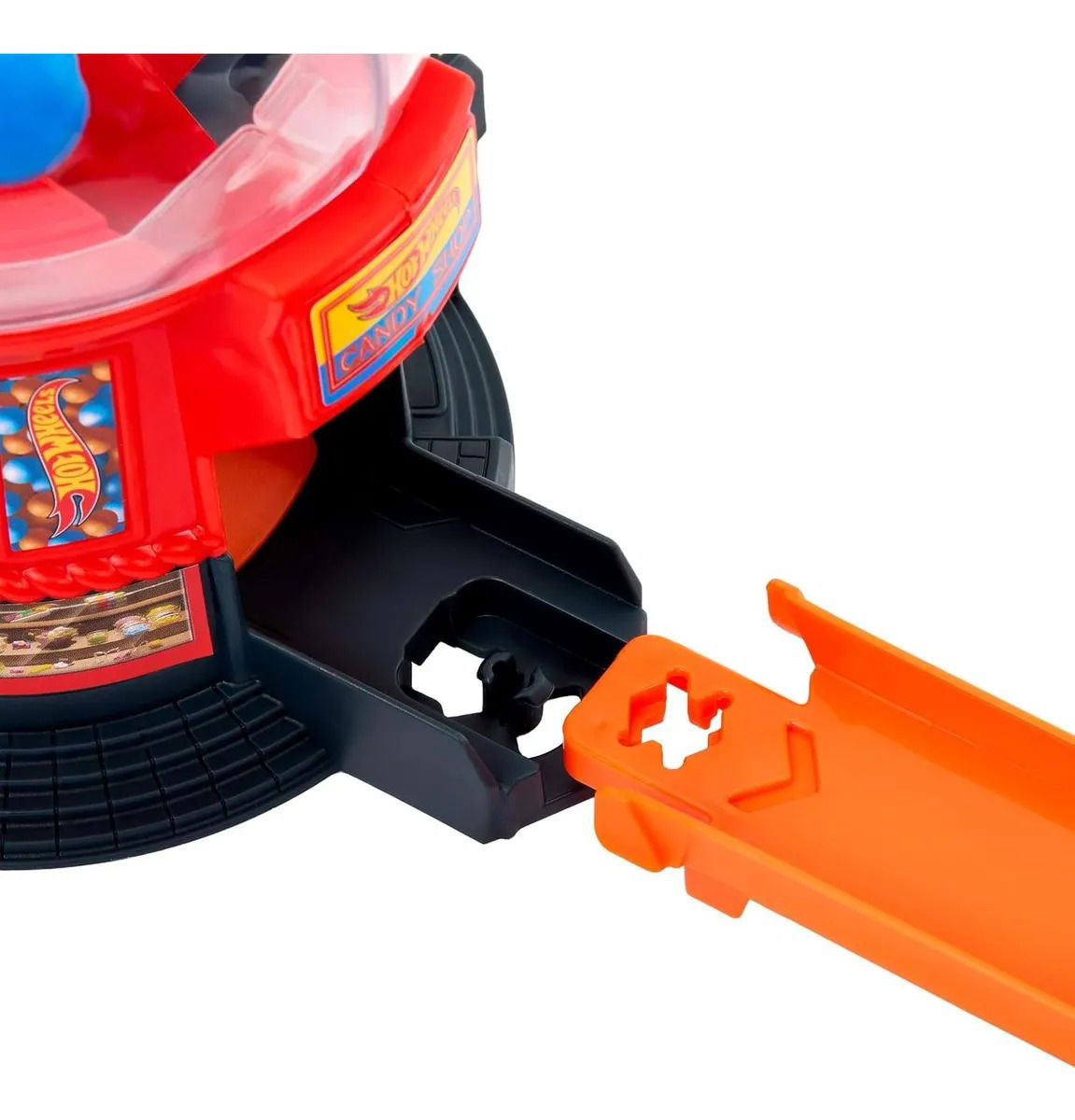 Acelera a través del lugar más dulce en la Ciudad Hot Wheels con la Tienda de Dulces del Centro. Este set en forma de máquina de Gumball. Presiona la ranura de monedas hacia abajo para hacer que las Gumballs se muevan y lanzar el auto por la rampa de salida. En la base, hay una puerta móvil para un juego interactivo y estacionamiento para autos adicionales. El set se puede conectar a otros sets y pistas de Hot Wheels utilizando el sistema de Pista Speed Snap. Se incluye un vehículo; vehículos, pistas y sets adicionales se venden por separado. Los colores y decoraciones pueden variar. CARACTERÍSTICAS