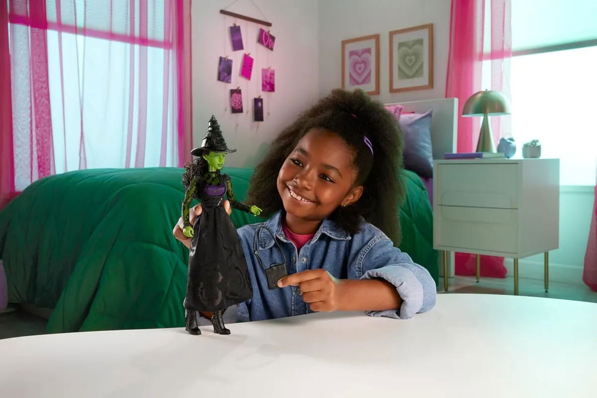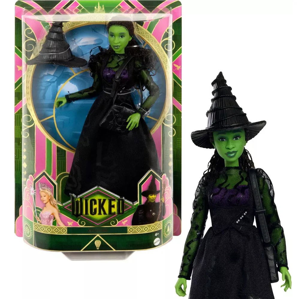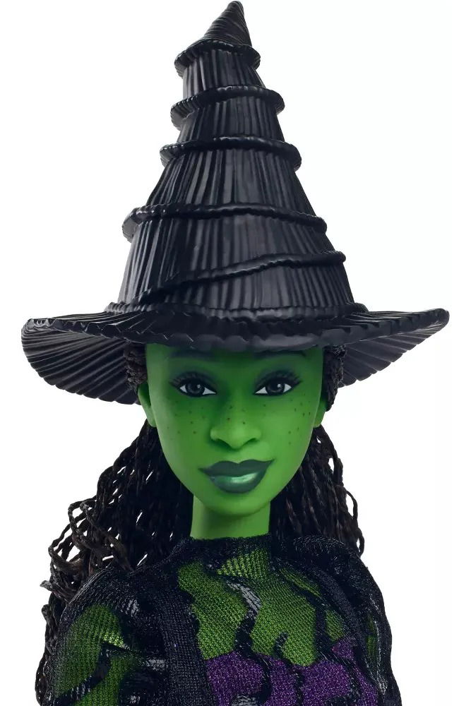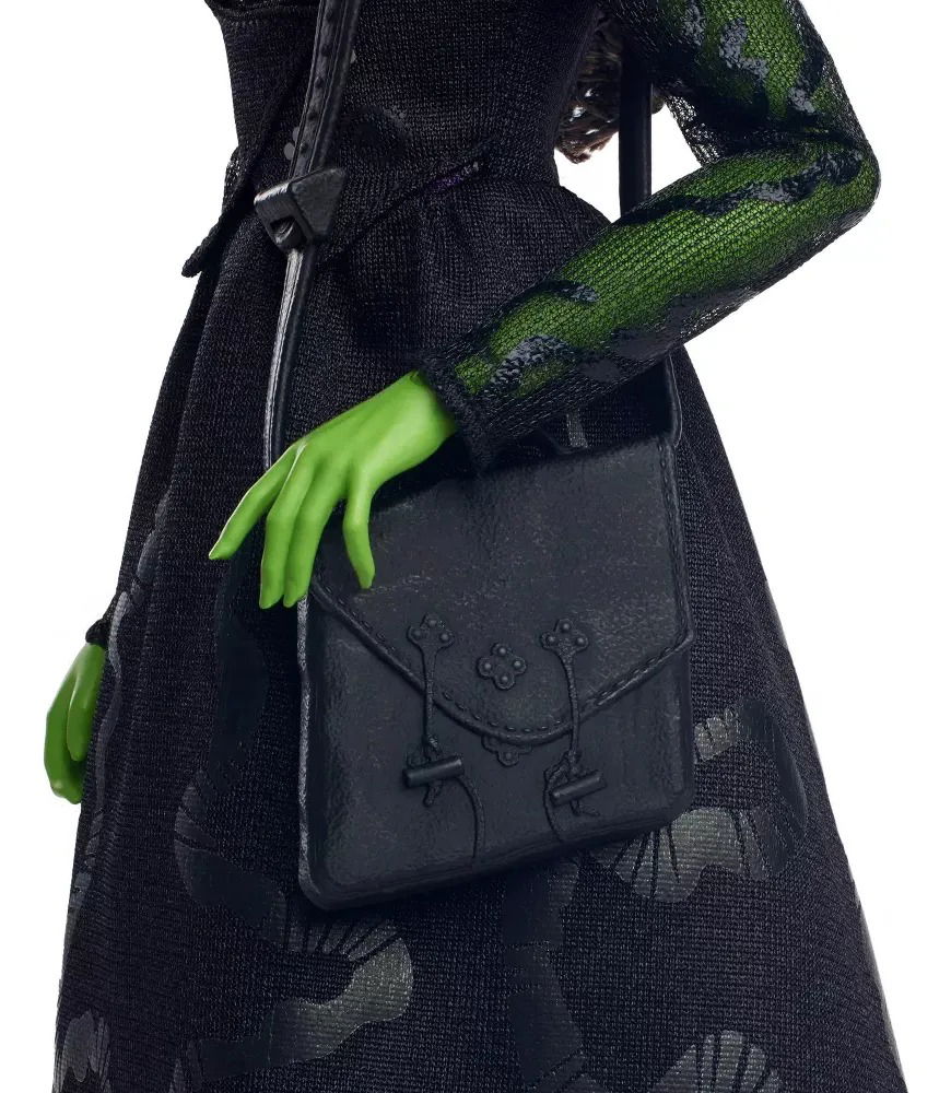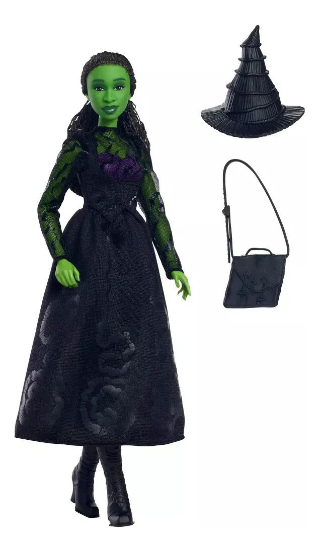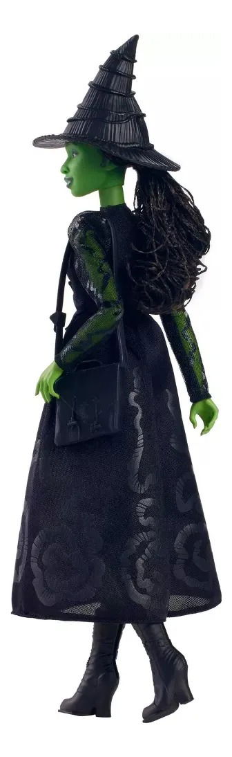 - Inspirada en “Wicked”, de Universal Pictures, la muñeca Elphaba lleva su inconfundible vestido con las mangas de encaje, que es de quita y pon, además de unas botas y el sombrero que la caracteriza.