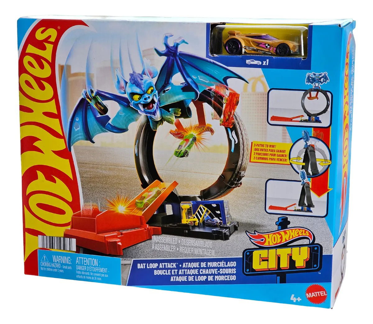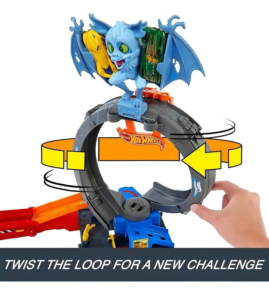Un murciélago salvaje ha atacado la tienda de neumáticos de Hot Wheels City, igual que en la serie de Netflix “Let's Race”, y solo los niños y las niñas con habilidades para hacer acrobacias pueden acabar con él. Lanza los coches a través de un looping para derribar al murciélago o ajusta el looping y el lanzador para apuntar directamente a la criatura.