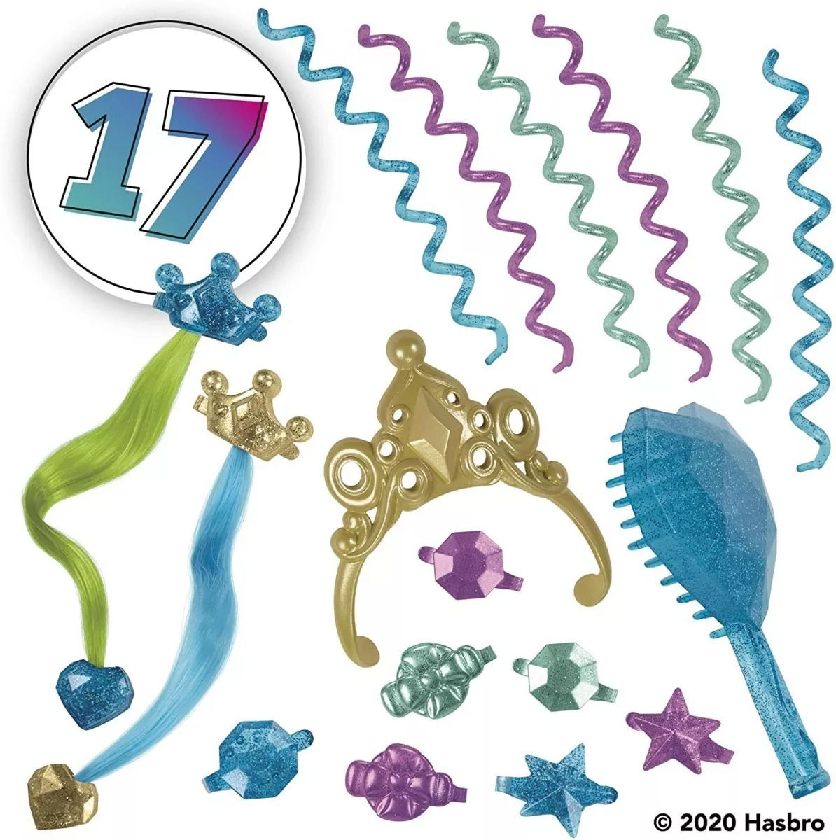 17 ACCESORIOS PARA EL CABELLO: Viene con un estilo portátil que incluye pasadores, extensiones de cabello, giros, cepillo para el cabello y una corona de princesa. Los clips y extensiones también se pueden usar en el cabello de los niños. Crea estilos increíbles con los exclusivos accesorios para torcer el cabello. Conecte un extremo del giro a la cabeza de la figura y envuélvalo con cabello. Luego, retuerce y peina de diferentes maneras.