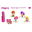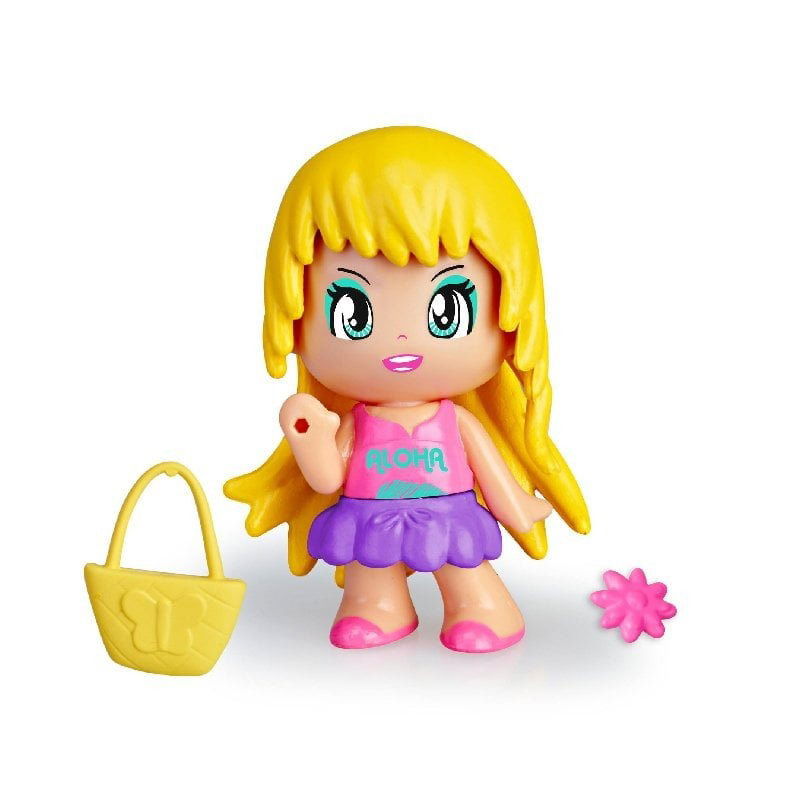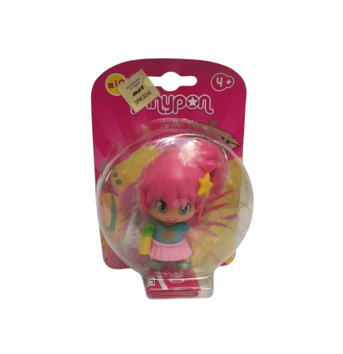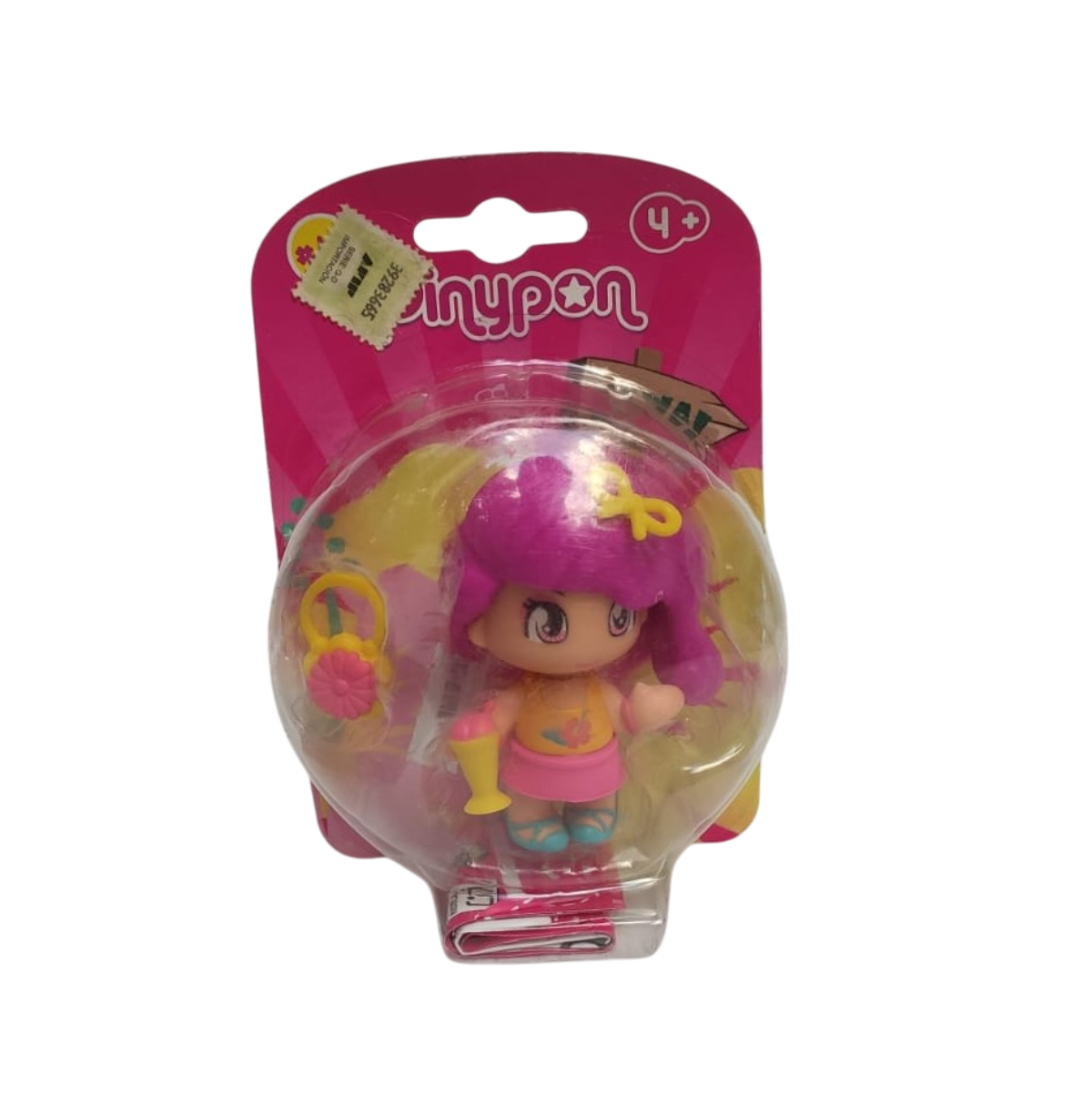 Blíster que contiene accesorios y una figura básica intercambiable de PinyPon. Puedes cambiar entre ellos su cabeza, torso, pies y accesorios.