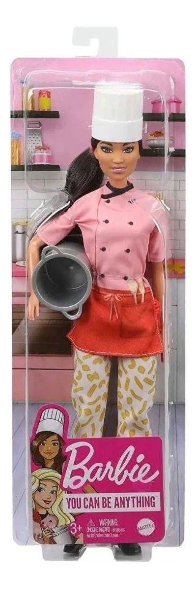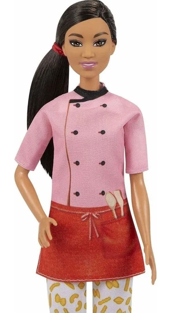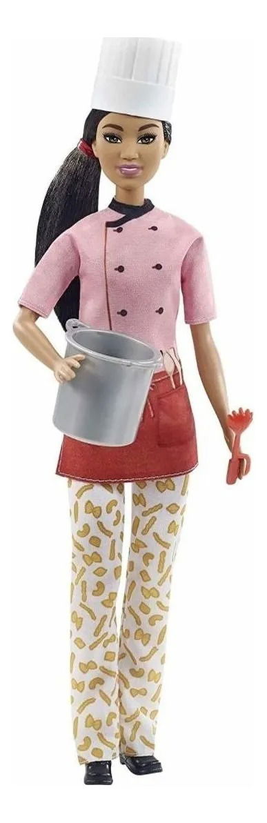 Barbie de Mattel, serie "Puedes ser lo que quieras", Chef de pasta. Barbie Yo Quiero Ser Cocinera Asiática ¡Explora un mundo de diversión culinaria con la muñeca chef de pasta Barbie! Cuando una niña juega con Barbie- imagina todo lo que puede llegar a ser- y si te encanta la pasta y la cocina- ¡puedes ser chef de pasta! La muñeca chef de pasta Barbie(30-40 cm) viste una colorida blusa de chef- lindos pantalones con estampado de macarrones- un gorro de chef blanco y una cola de caballo deportiva. También viene con una olla para pasta y un cortador de pasta que puede sujetar mientras 'cocina'. A los niños les encantarán las infinitas posibilidades de expresión creativa y la diversión de contar historias. La muñeca no puede estar sola. Los colores y las decoraciones pueden variar. La muñeca chef de pasta Barbie puede sostener el cortador de pasta y la olla de pasta para un juego realista.