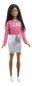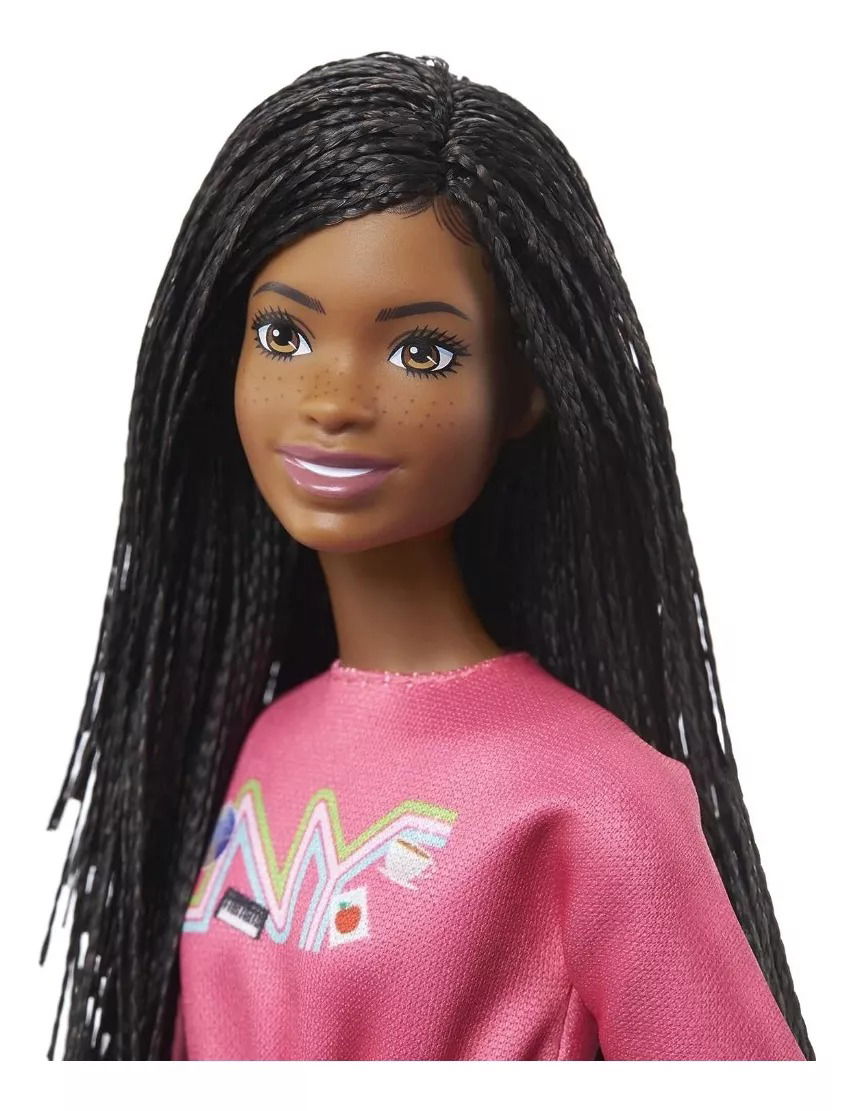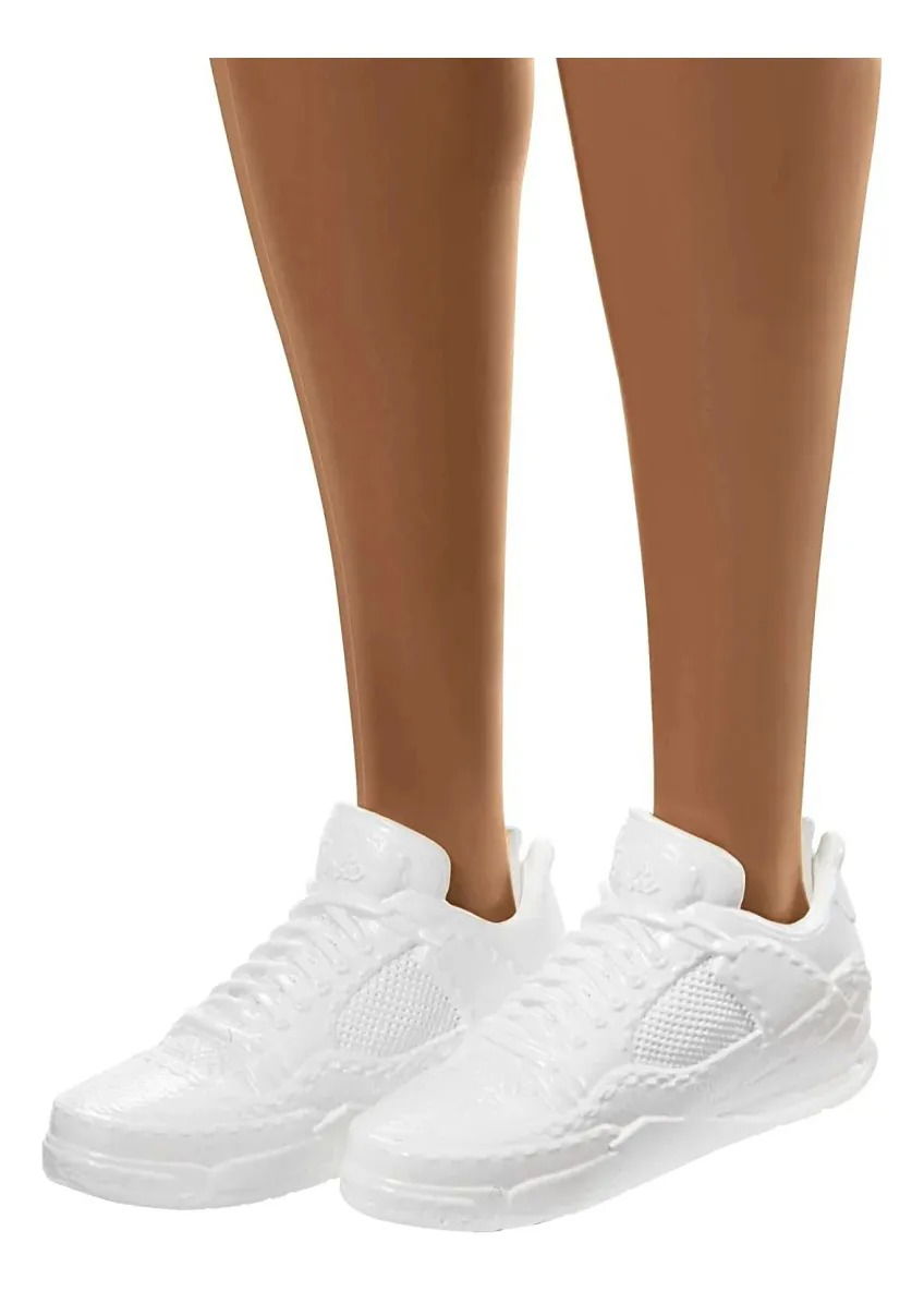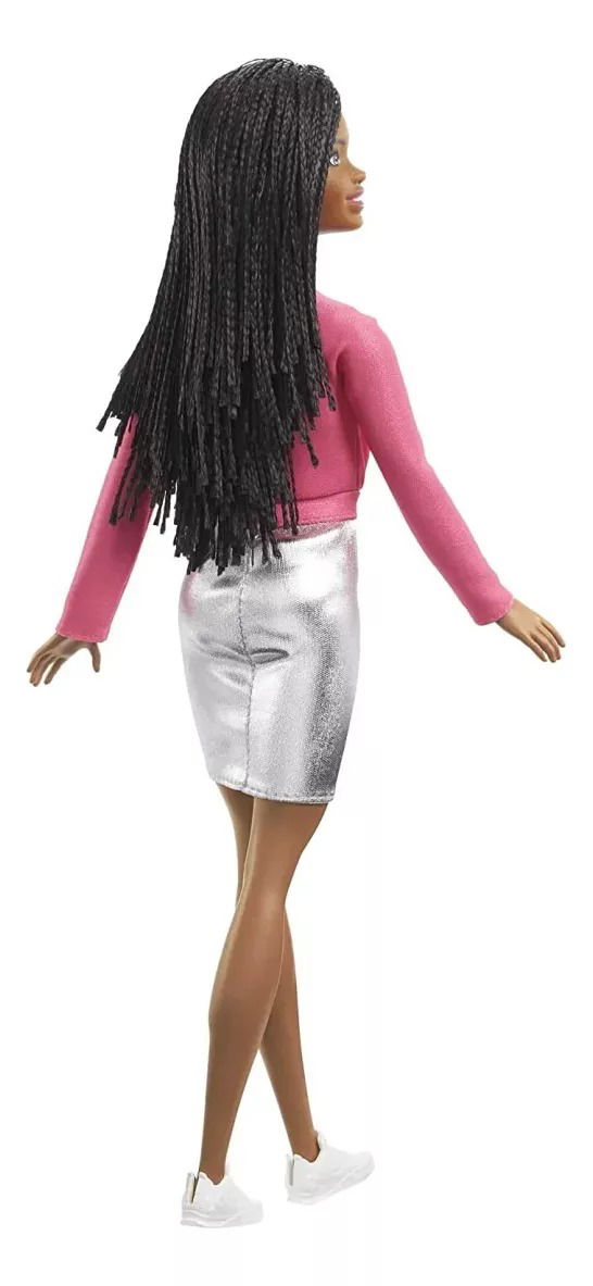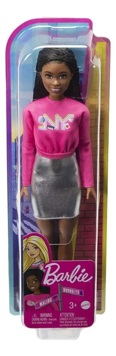 La muñeca Barbie 'Brooklyn' Roberts se parece a su personaje en pantalla con una camisa rosa con un gráfico de Nueva York y una moderna falda metálica plateada. Las zapatillas blancas completan su look lindo y casual. Medida de la muñeca: 29cm