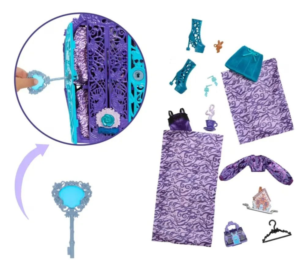 1 muñeca Monster High, 1 armario con dos puertas, 1 llave, 2 mapas, 3 dijes de amuleto, 2 Perchas, ropa y accesorios variados. La muñeca no se puede mantener de pie por sí sola.
