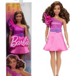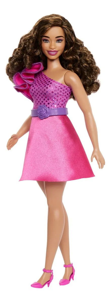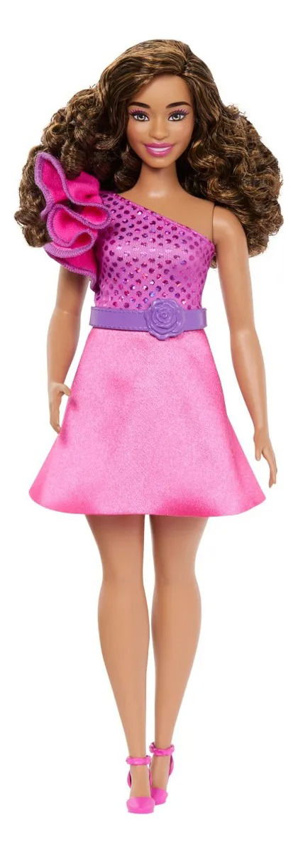 Barbie Fashionistas - Muñeca n.º 225, con cuerpo curvilíneo, cabello marrón, vestido brillante y accesorios, de moda