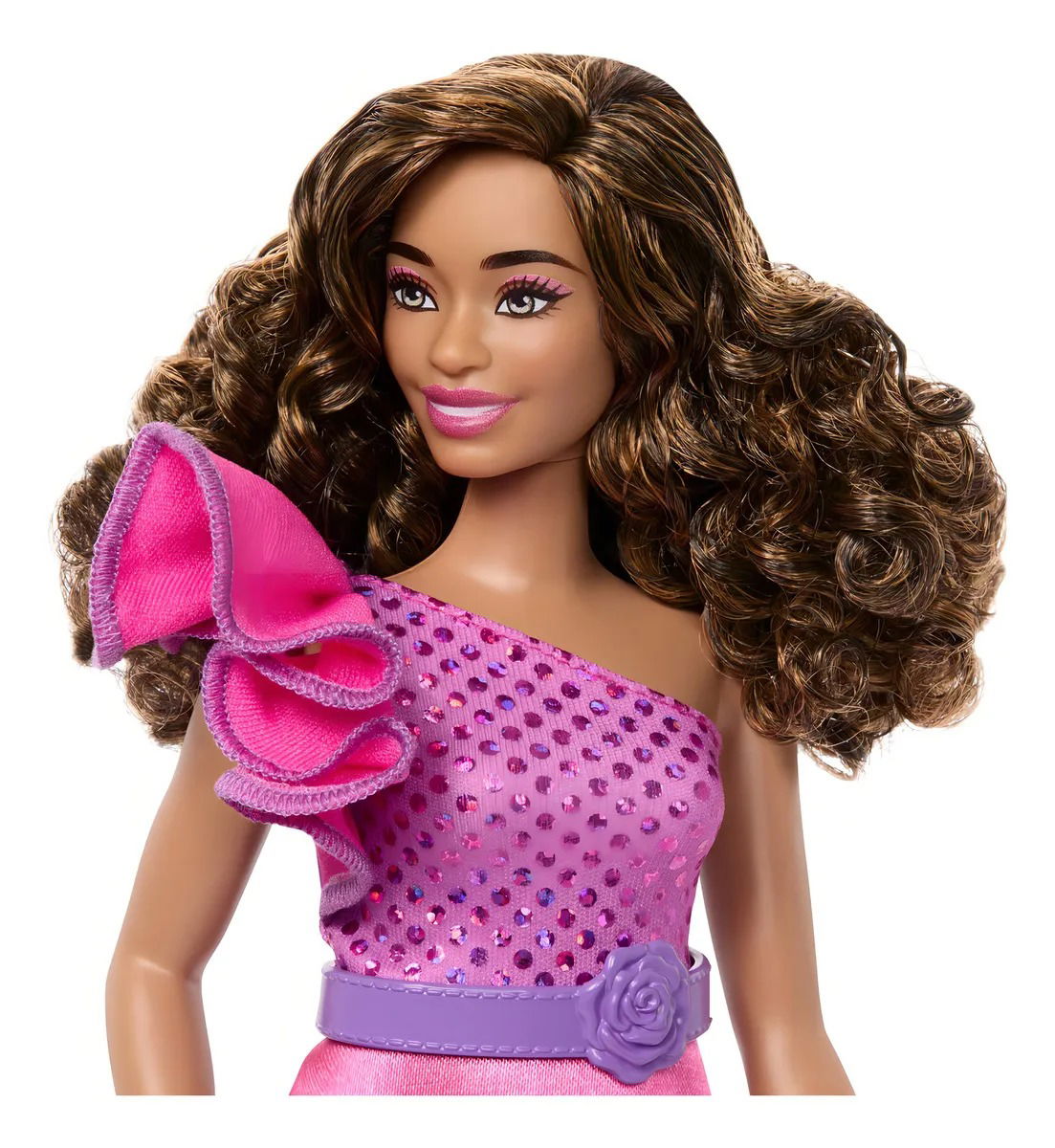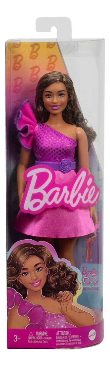Inspirada en su look Dream Date de 1993, la muñeca Barbie Fashionistas lleva un vestido rosa con volante en un hombro y un corpiño brillante.