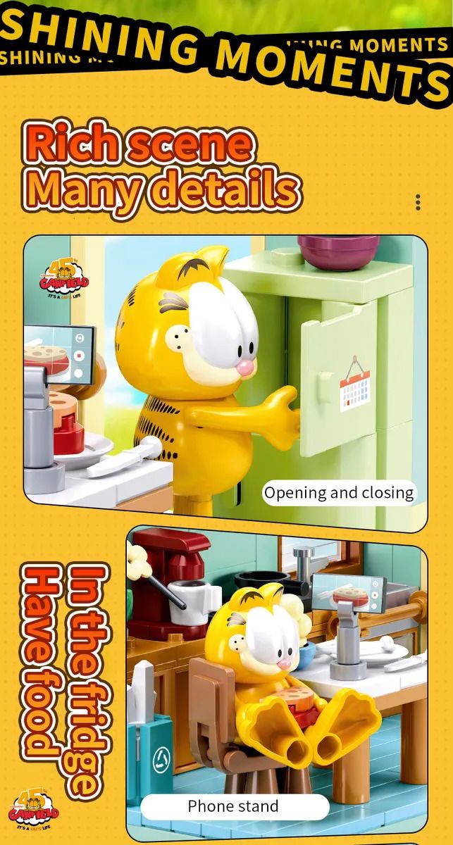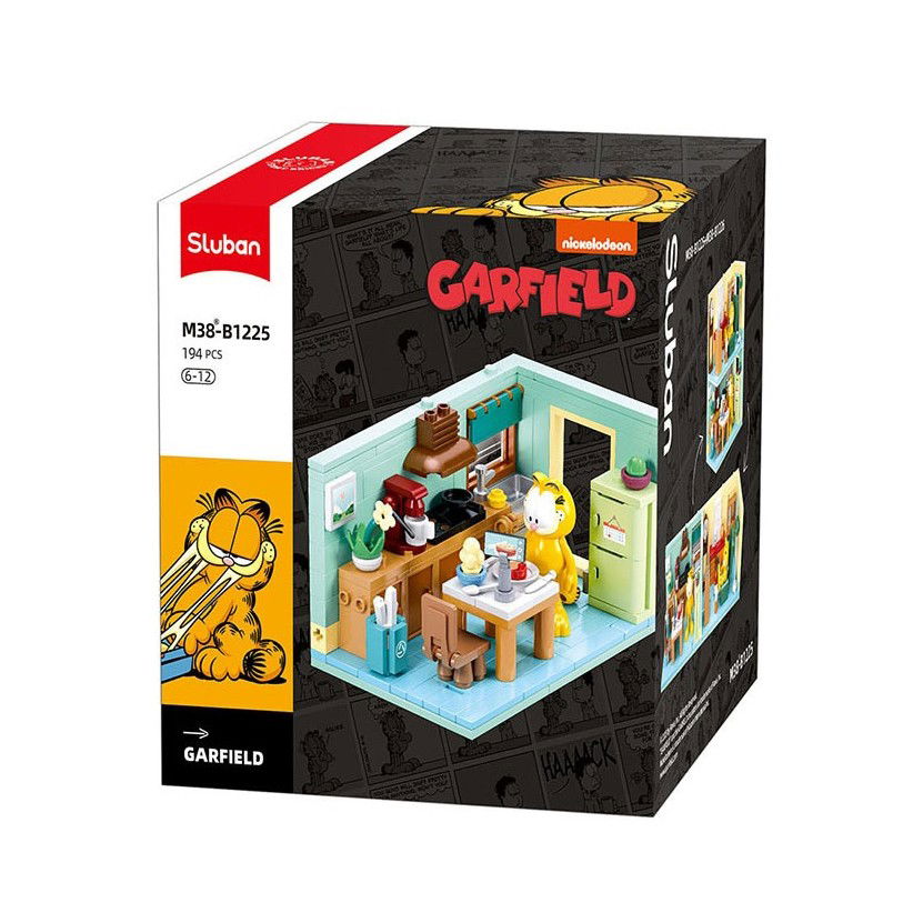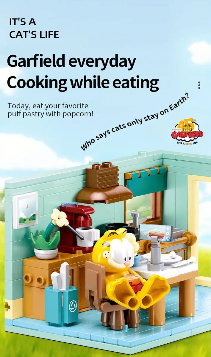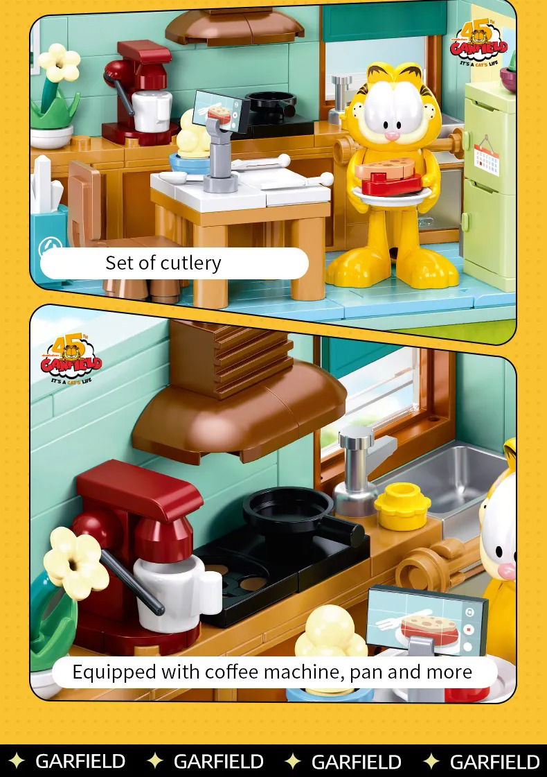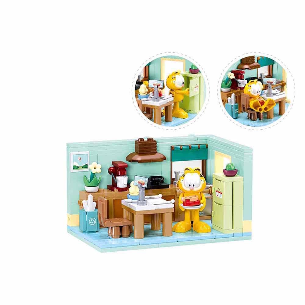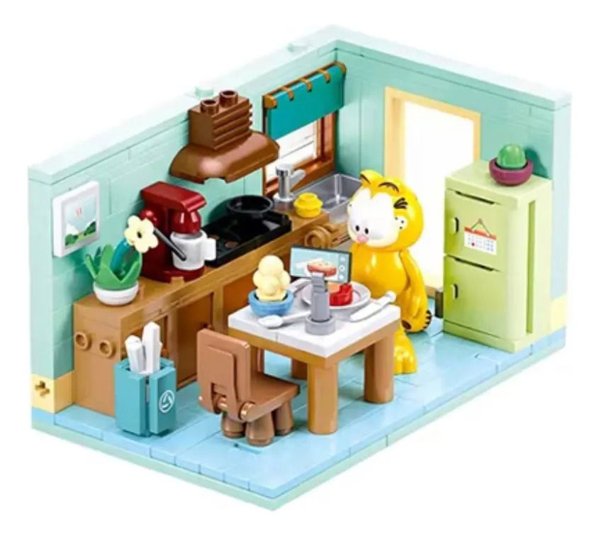 El set de construcción llamado "Garfield's A Daily Meal Routine" o "La rutina diaria de Garfield", es una propuesta creativa que captura la esencia del famoso gato de cómic en su entorno cotidiano.