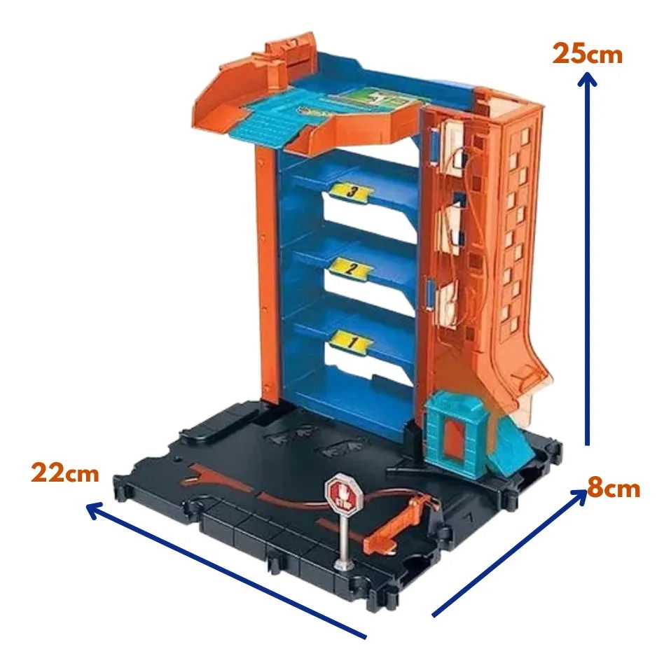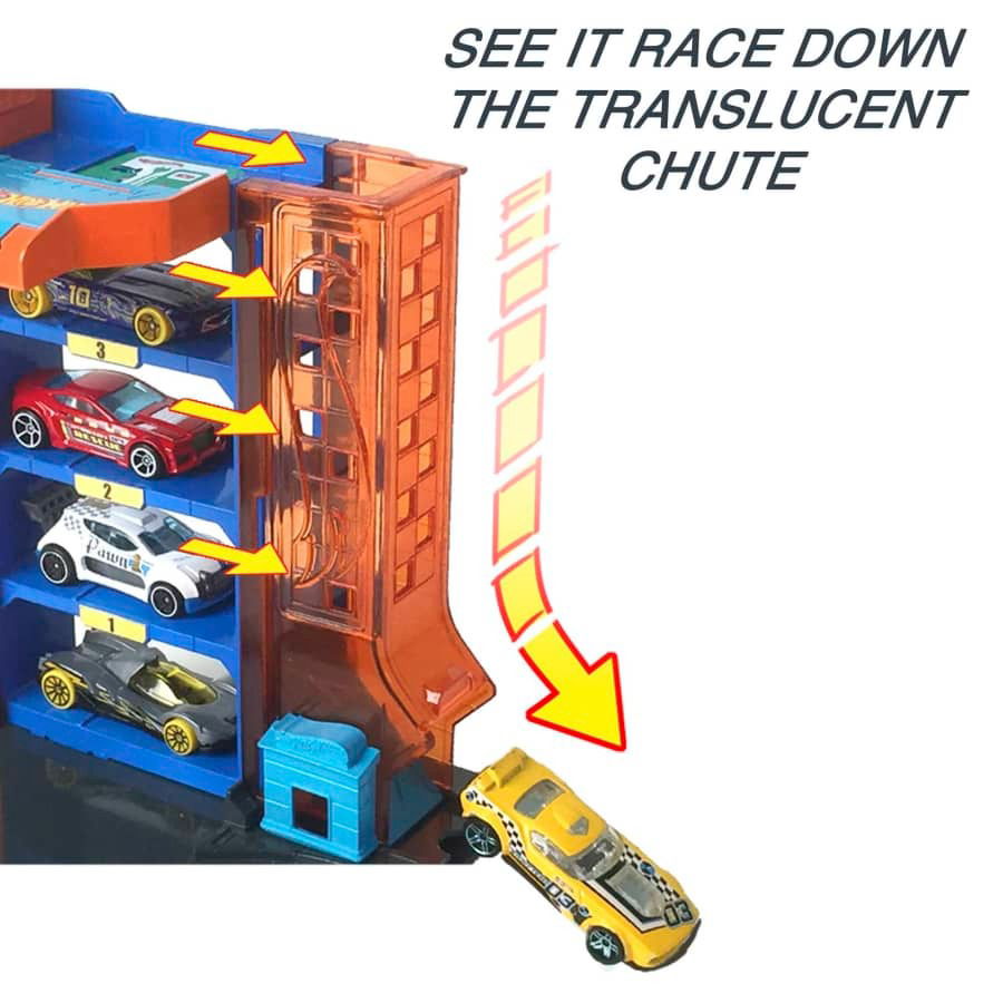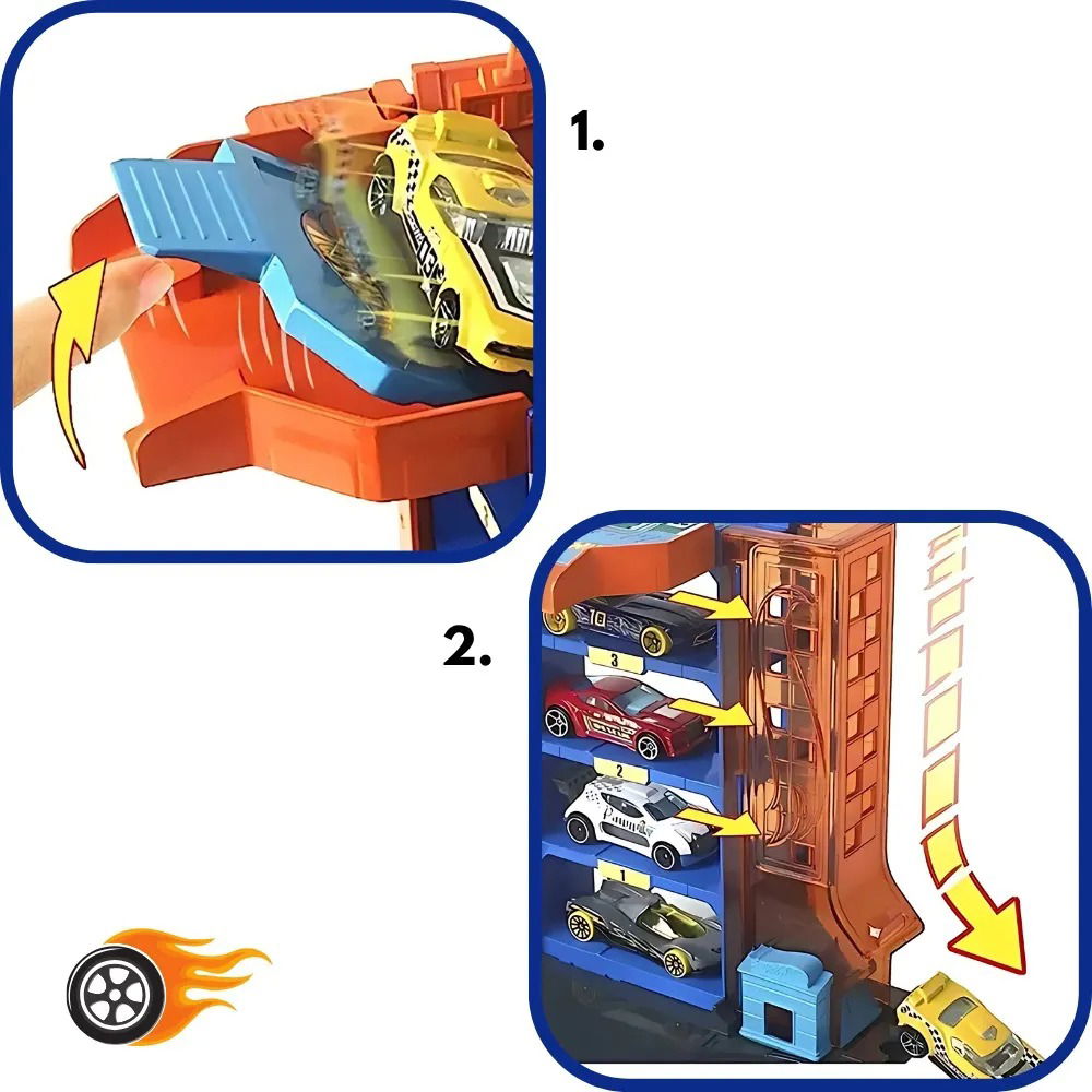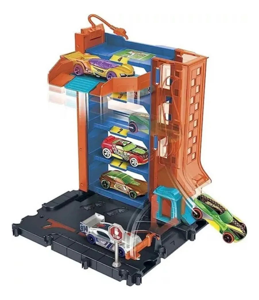 ¡El aparcamiento del centro de Hot Wheels City ofrece un amplio espacio y una experiencia increíble, con 4 niveles para albergar 4 vehículos diferentes, además de elementos móviles como un elevador manual para coches, un "cargador" para vehículos eléctricos y una rampa de salida translúcida!