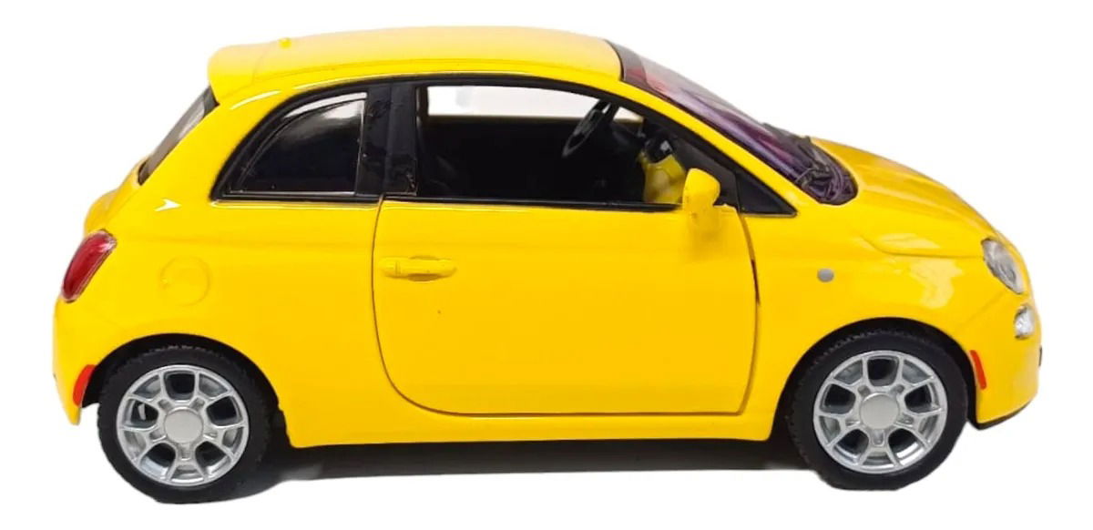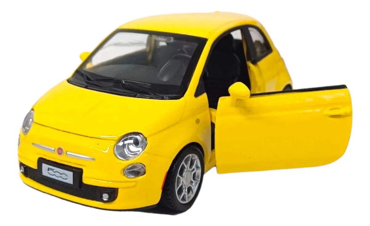 Modelo Fiat 500 con cuerpo de metal, luces y sonido. Modelo con apertura de puertas delanteras, una revelación para un pequeño ventilador motor. Cuando se presiona sobre las ruedas delanteras, el automóvil emite el sonido del motor encendido y agrega gas. Además, las luces se encienden en tres colores: blanco delantero, rojo trasero y el tablero de instrumentos en el interior del vehículo se ilumina con luz azul.