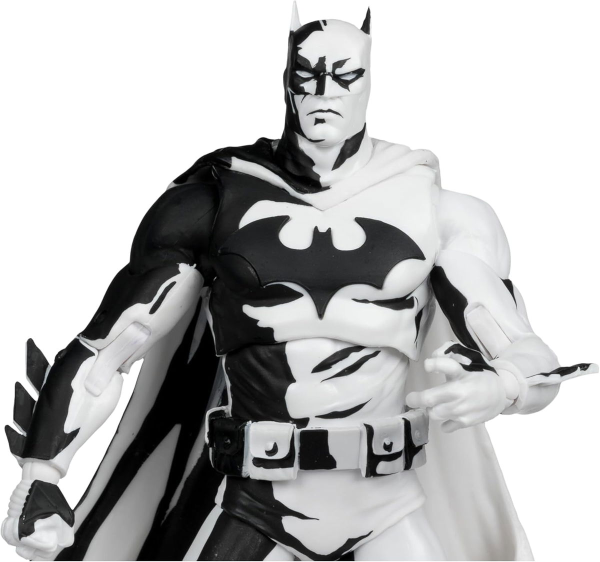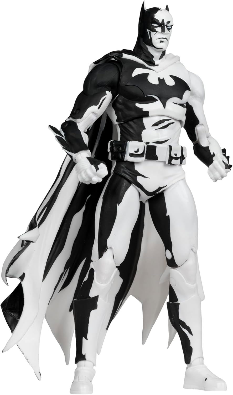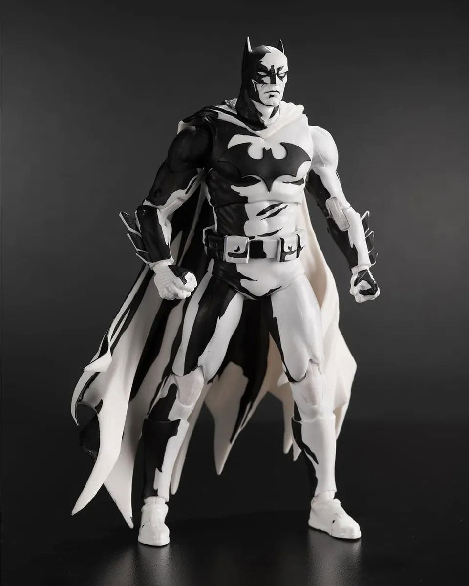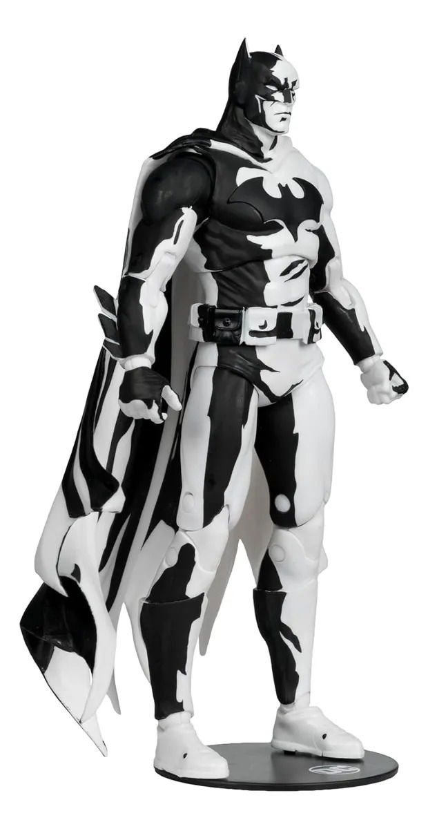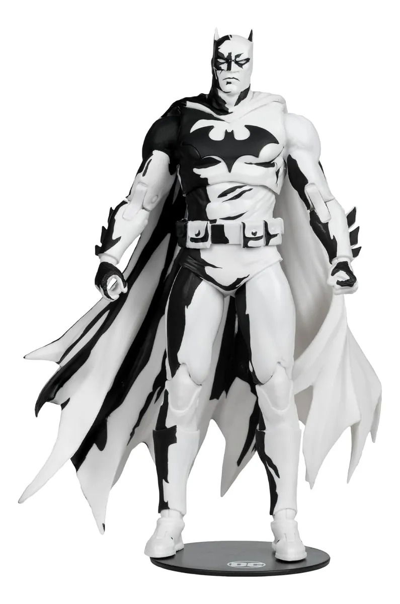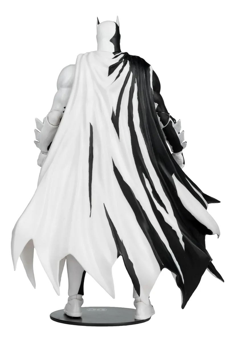 Manos adicionales, 2 batarangs, base de exhibición y soporte para tarjetas. También se incluye una tarjeta de arte exclusiva con Batman en un lado y un certificado de autenticidad numerado en el otro. Totalmente articulado, el Caballero Oscuro en blanco y negro se exhibe en un embalaje de diseño con ventanilla con un exclusivo soporte para tarjetas y una base de exhibición del logotipo de Batman.