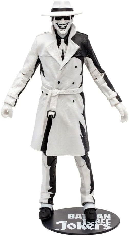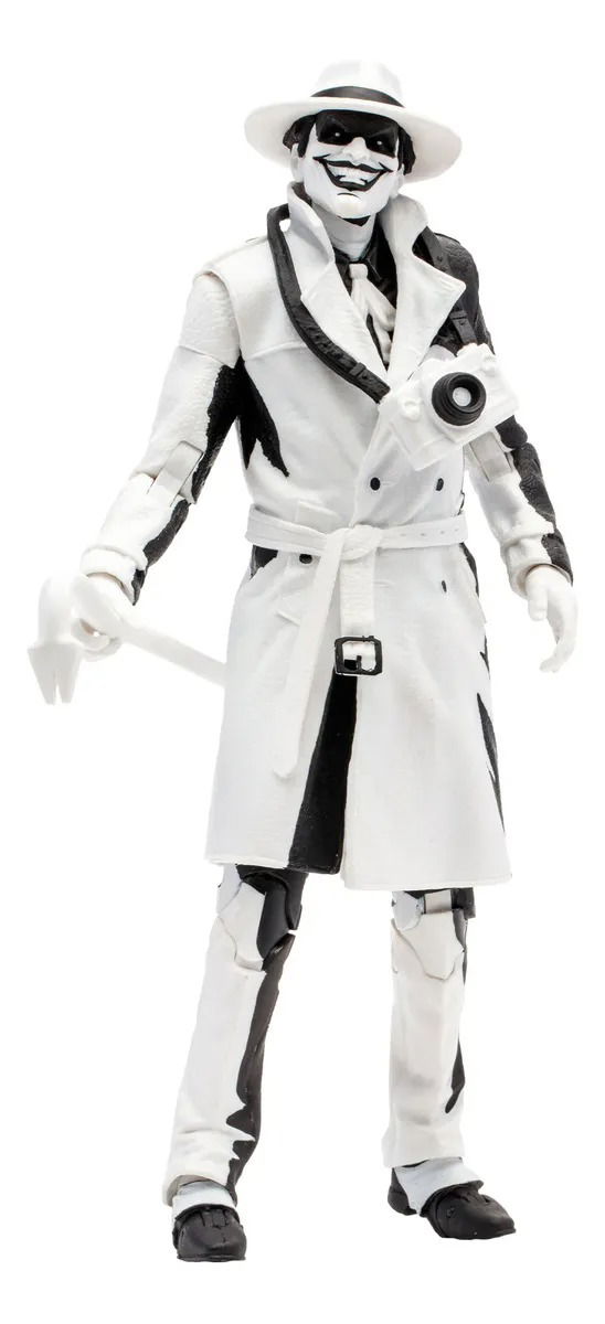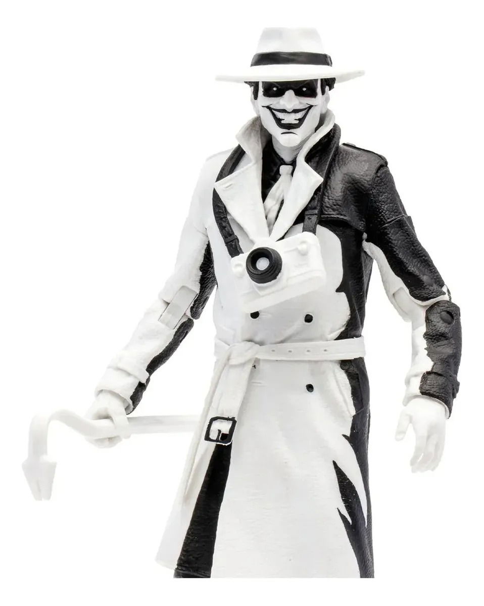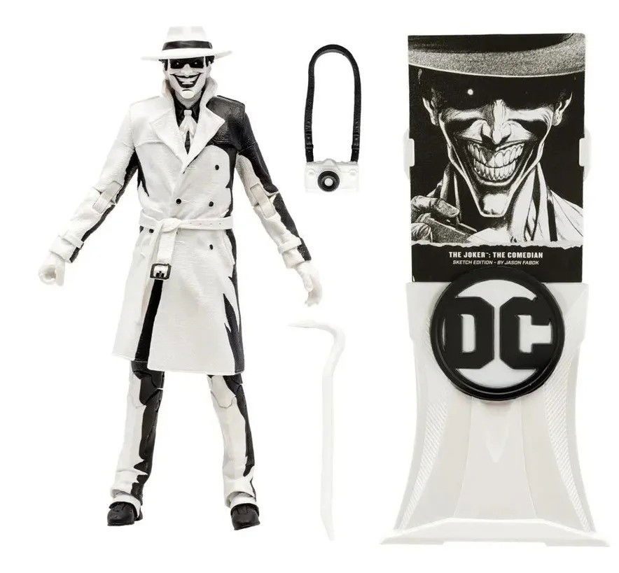 Esta figura del Joker Comedian, está totalmente articulada para una amplia gama de poses y juegos. Cuenta con una altura aproximada de 18 cm de alto. Incluye una palanca y una cámara para documentar el caos que va dejando a su paso, una base de exhibición, soporte de tarjeta exclusivo y una tarjeta de arte exclusiva con un boceto del Jocker diseñado por Jason Fabok en un lado y un certificado de autenticidad numerado.