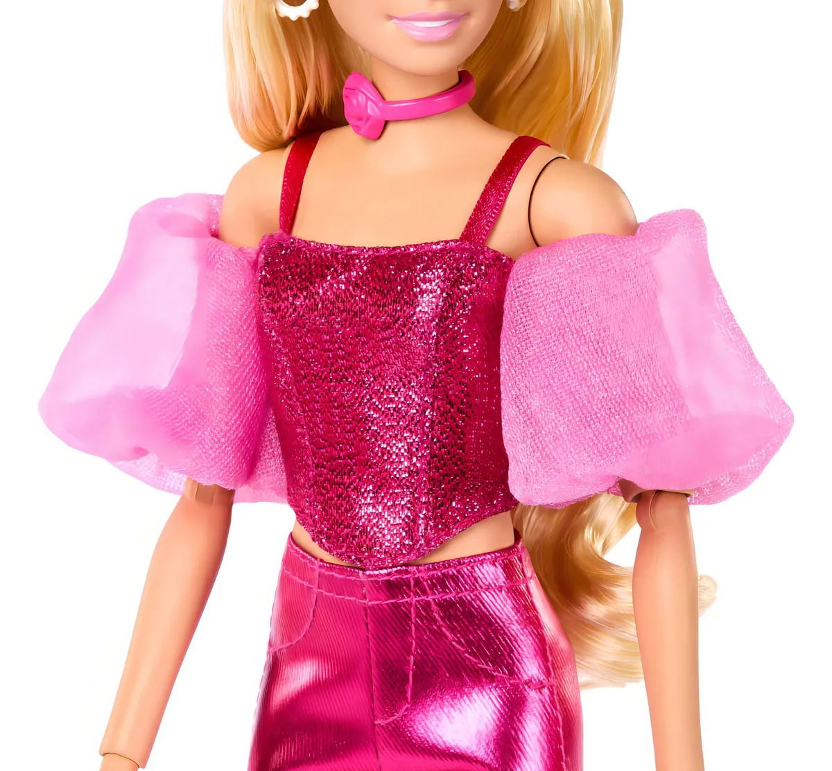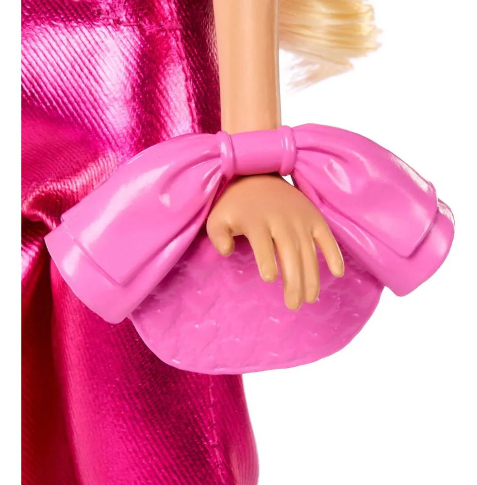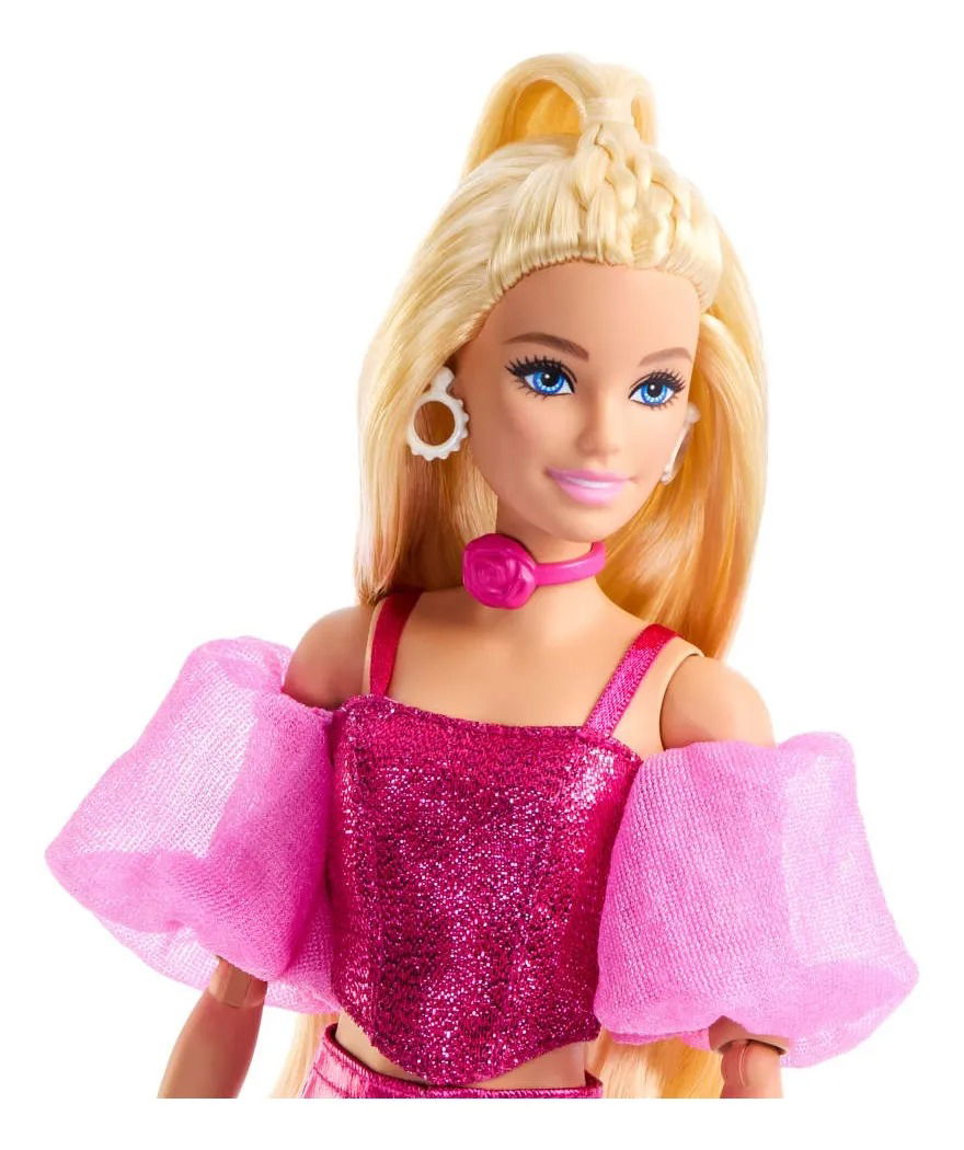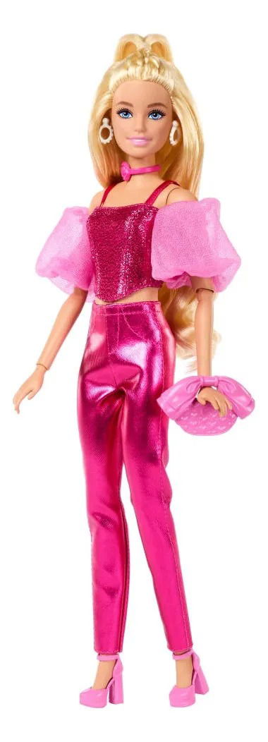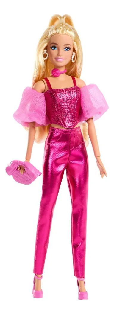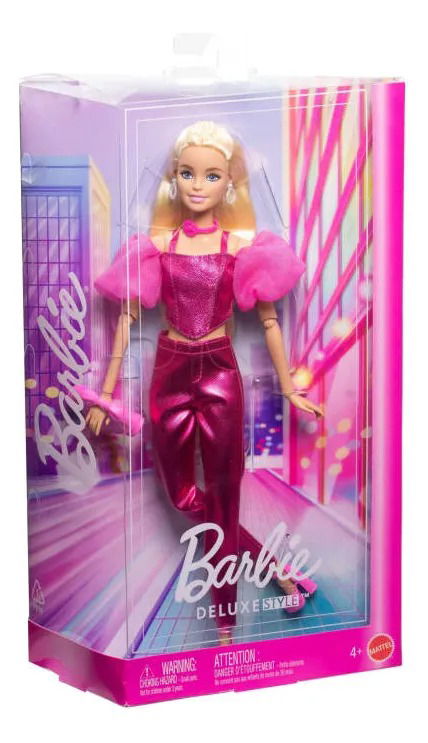 Barbie Deluxe Style N° 5 deslumbra con su cabello rubio largo y un outfit rosa metálico que combina glamour y actitud. El conjunto incluye un corset brillantes, pantalones satinados y mangas organzas que le den un toque de alta moda irresistible.