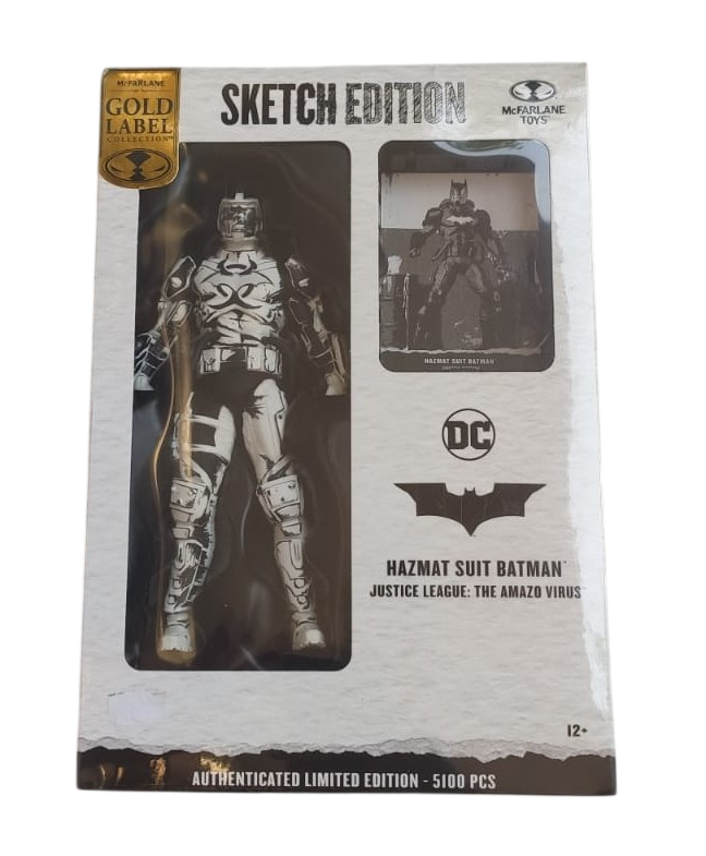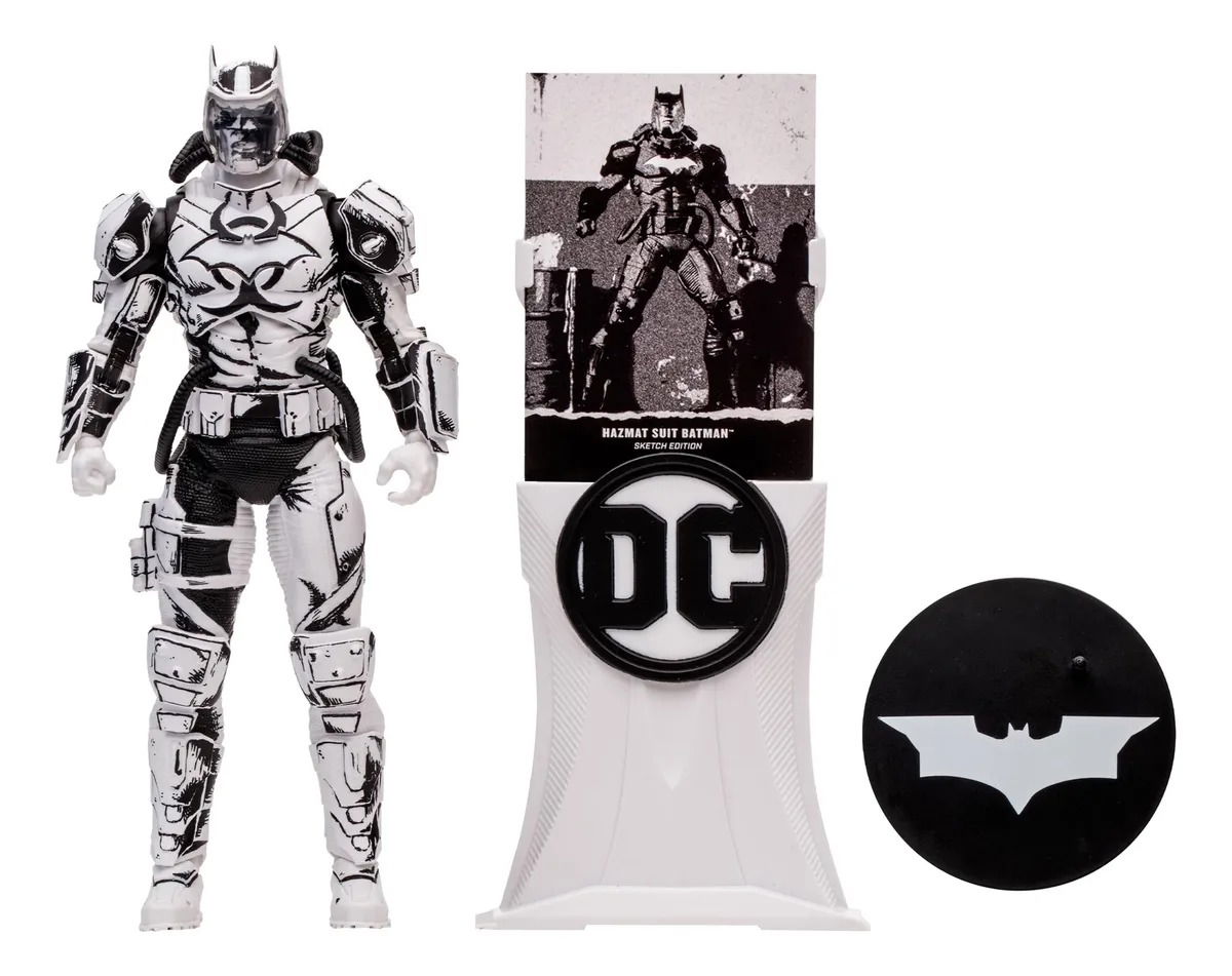 Batman Hazmat Suit es presentado en su estilo de la edición de bocetos, en una caja de diseño exclusiva. Incluye base y soporte para tarjetas.