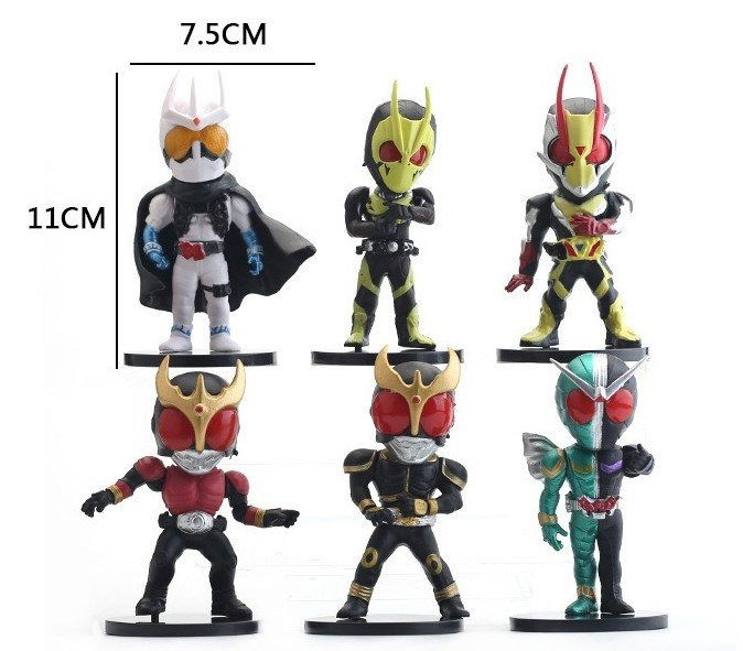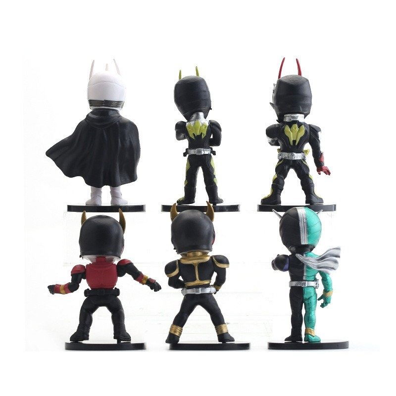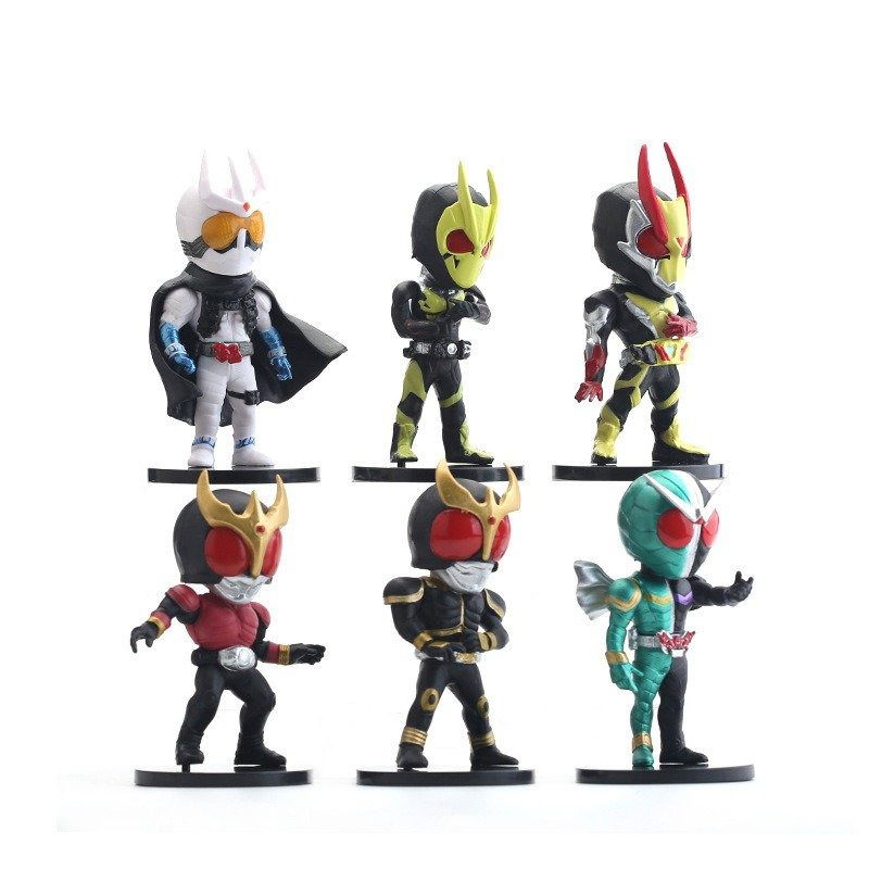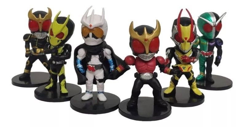 Los famosos personajes de Kamen Rider con sus icónicas posturas en una estilización Chibi/SD. Incluye Kuuga, Ryuki, Zero-one , Aruto, Agito, Zero-Two.