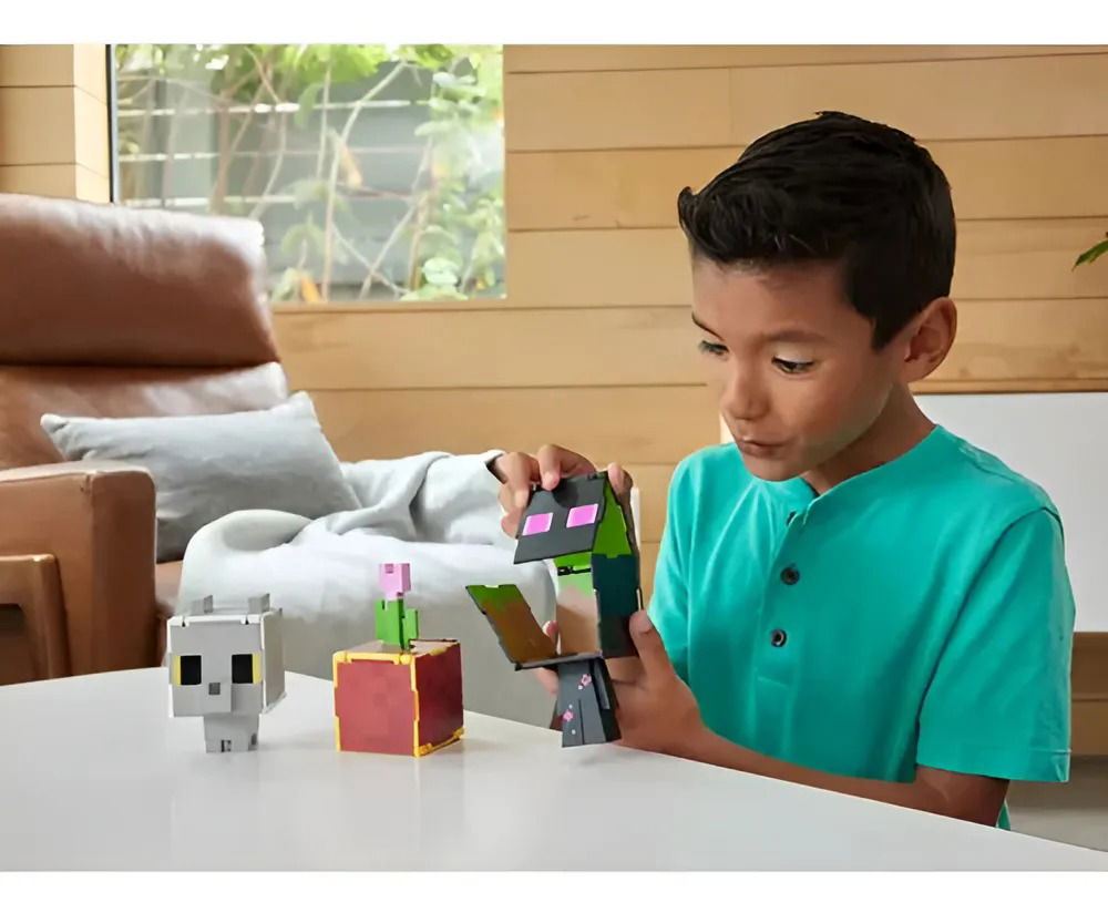 Con una escala de aproximadamente 9,5 cm, esta figura se transforma fácilmente de Bebé Renifleur a Renifleur en segundos, levantando los paneles de la cabeza y bloqueándolos en su lugar. Su diseño pixelado, fiel al estilo del videojuego Minecraft, la hace perfecta para jugar, coleccionar y exhibir. ¡Ábrela, transforma la figura y disfruta de horas de juego creativo con Minecraft!