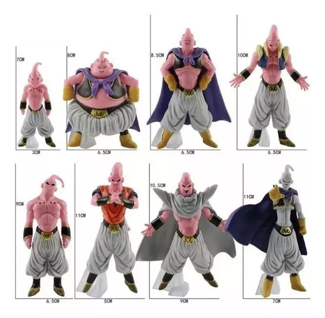 Tamaño :Majin Buu: aproximadamente 80 mm, Majin Buu (mal puro): aproximadamente 110 mm, Majin Buu (mal): aproximadamente 93 mm, Majin Buu (absorción de Gotenks): aproximadamente 100 mm, Majin Buu (absorción de Piccolo): aproximadamente 103 mm, Majin Buu (absorción final de Goten): aproximadamente 108 mm, Majin Buu (puro): aproximadamente 70 mm, Majin Buu (forma): aproximadamente 90 mm